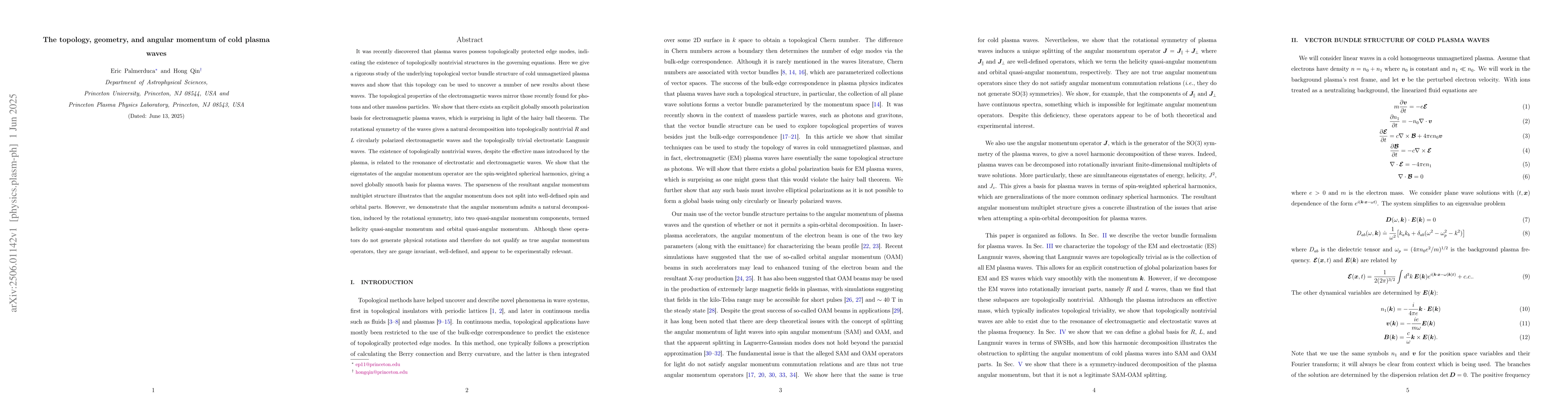 This work is novel due to its identification of topologically nontrivial structures in plasma wave equations, its explicit globally smooth polarization basis contradicting the hairy ball theorem, and the decomposition of angular momentum into helicity and orbital quasi-angular momentum components.