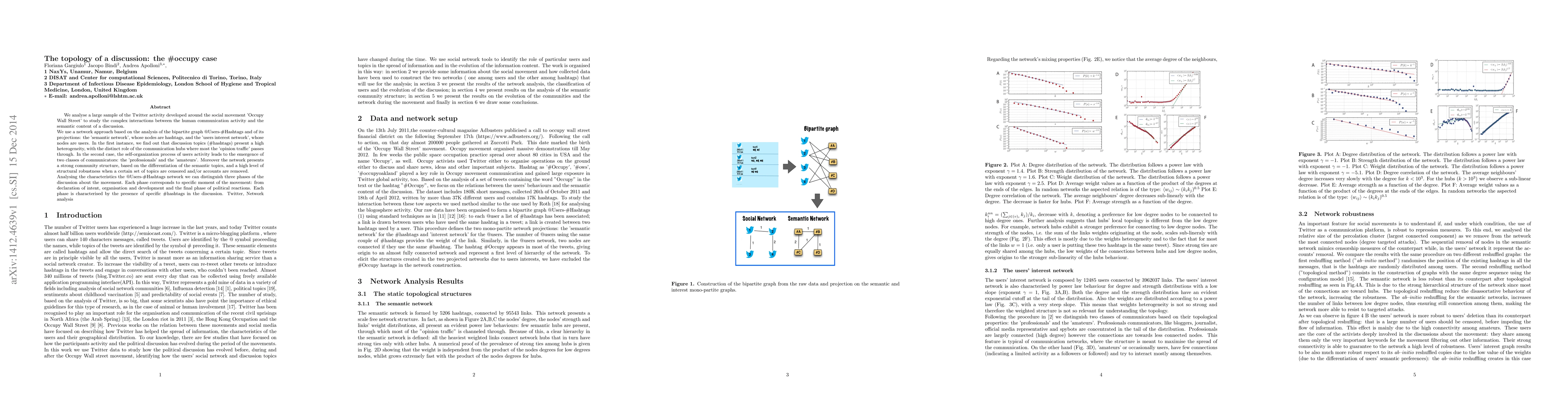 We analyse a large sample of the Twitter activity developed around the social movement 'Occupy Wall Street' to study the complex interactions between the human communication activity and the semantic content of a discussion. We use a network approach based on the analysis of the bipartite graph @Users-#Hashtags and of its projections: the 'semantic network', whose nodes are hashtags, and the 'users interest network', whose nodes are users In the first instance, we find out that discussion topics (#hashtags) present a high heterogeneity, with the distinct role of the communication hubs where most the 'opinion traffic' passes through. In the second case, the self-organization process of users activity leads to the emergence of two classes of communicators: the 'professionals' and the 'amateurs'. Moreover the network presents a strong community structure, based on the differentiation of the semantic topics, and a high level of structural robustness when a certain set of topics are censored and/or accounts are removed. Analysing the characteristics the @Users-#Hashtags network we can distinguish three phases of the discussion about the movement. Each phase corresponds to specific moment of the movement: from declaration of intent, organisation and development and the final phase of political reactions. Each phase is characterised by the presence of specific #hashtags in the discussion. Keywords: Twitter, Network analysis