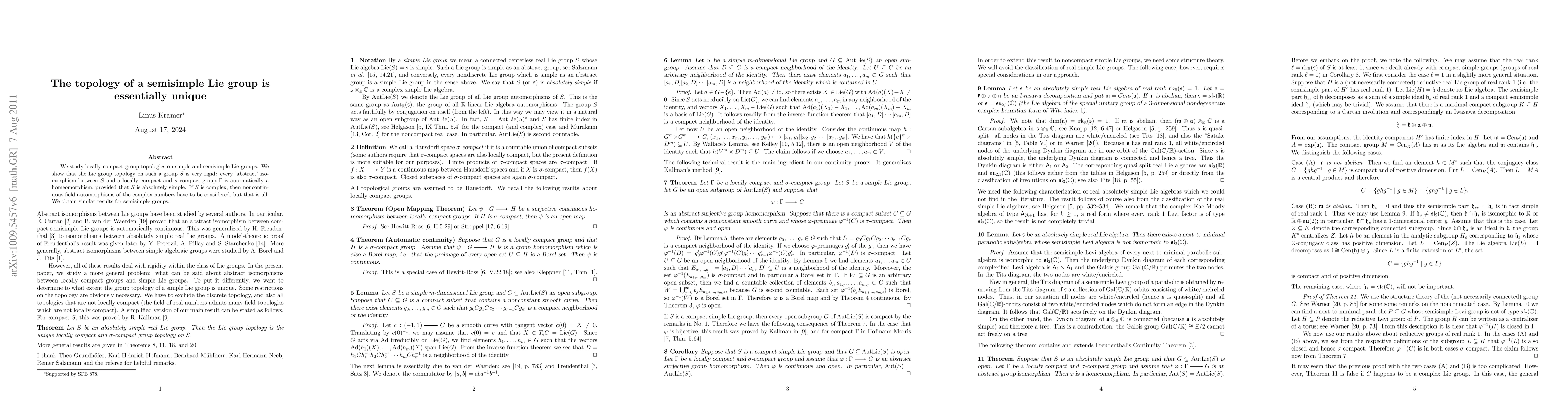 This paper demonstrates that the topology of a semisimple Lie group $S$ is essentially unique; any isomorphism between $S$ and another locally compact, $\sigma$-compact group $\Gamma$ is a homeomorphism, emphasizing the rigidity of the Lie group topology, with special consideration for non-continuous field automorphisms when $S$ is complex.