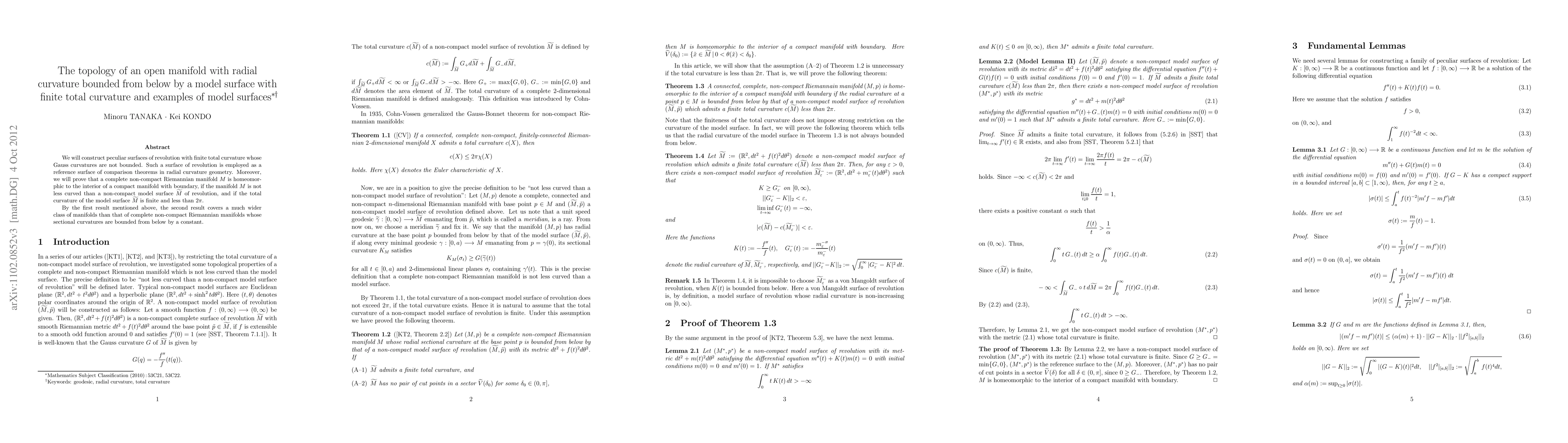 This paper constructs surfaces of revolution with finite total curvature and unbounded Gauss curvature, using them as model references in radial curvature geometry. It also proves that a complete non-compact Riemannian manifold with radial curvature bounded below by a finite total curvature model surface is homeomorphic to the interior of a compact manifold with boundary.