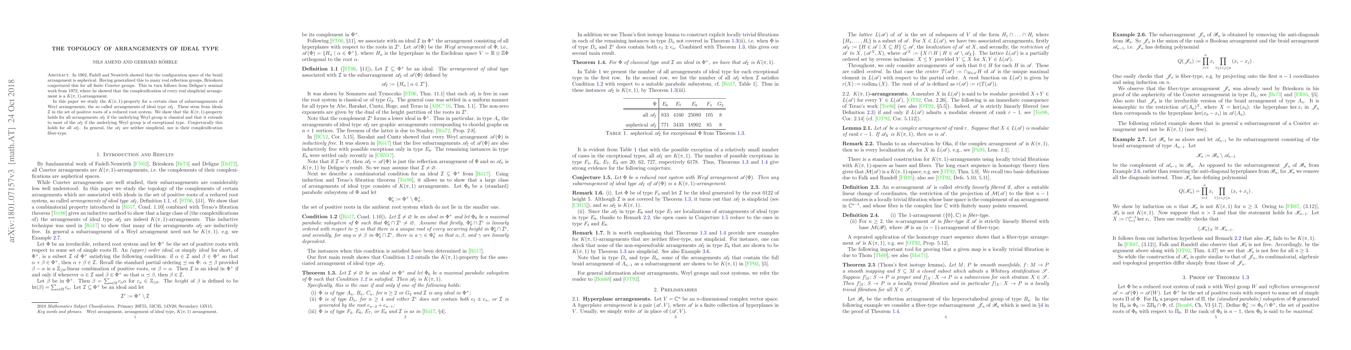 In 1962, Fadell and Neuwirth showed that the configuration space of the braid arrangement is aspherical. Having generalized this to many real reflection groups, Brieskorn conjectured this for all finite Coxeter groups. This in turn follows from Deligne's seminal work from 1972, where he showed that the complexification of every real simplicial arrangement is a $K(\pi,1)$-arrangement. In this paper we study the $K(\pi,1)$-property for a certain class of subarrangements of Weyl arrangements, the so called arrangements of ideal type ${\mathscr A}_I$. These stem from ideals $I$ in the set of positive roots of a reduced root system. We show that the $K(\pi,1)$-property holds for all arrangements ${\mathscr A}_I$ if the underlying Weyl group is classical and that it extends to most of the ${\mathscr A}_I$ if the underlying Weyl group is of exceptional type. Conjecturally this holds for all ${\mathscr A}_I$. In general, the ${\mathscr A}_I$ are neither simplicial, nor is their complexification fiber type.
