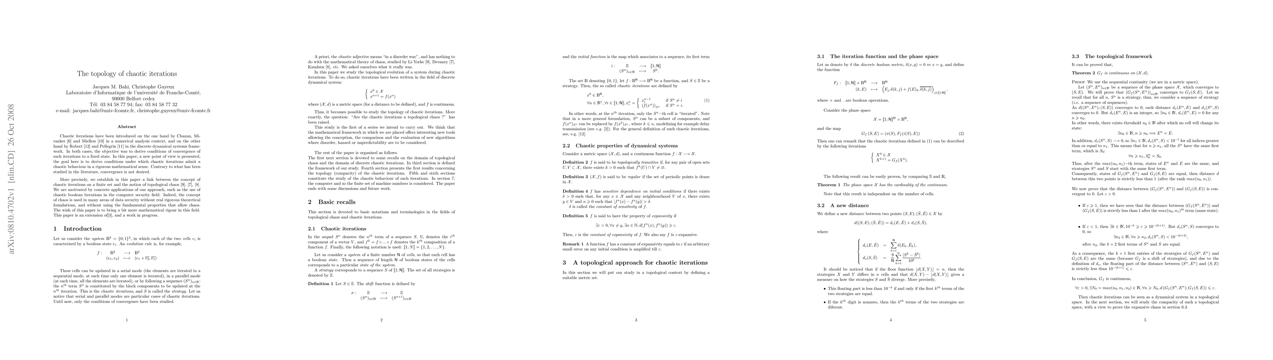Chaotic iterations have been introduced on the one hand by Chazan, Mi- ranker [6] and Miellou [10] in a numerical analysis context, and on the other hand by Robert [12] and Pellegrin [11] in the discrete dynamical systems frame- work. In both cases, the objective was to derive conditions of convergence of such iterations to a fixed state. In this paper, a new point of view is presented, the goal here is to derive conditions under which chaotic iterations admit a chaotic behaviour in a rigorous mathematical sense. Contrary to what has been studied in the literature, convergence is not desired. More precisely, we establish in this paper a link between the concept of chaotic iterations on a finite set and the notion of topological chaos [9], [7], [8]. We are motivated by concrete applications of our approach, such as the use of chaotic boolean iterations in the computer security field. Indeed, the concept of chaos is used in many areas of data security without real rigorous theoretical foundations, and without using the fundamental properties that allow chaos. The wish of this paper is to bring a bit more mathematical rigour in this field. This paper is an extension of[3], and a work in progress.