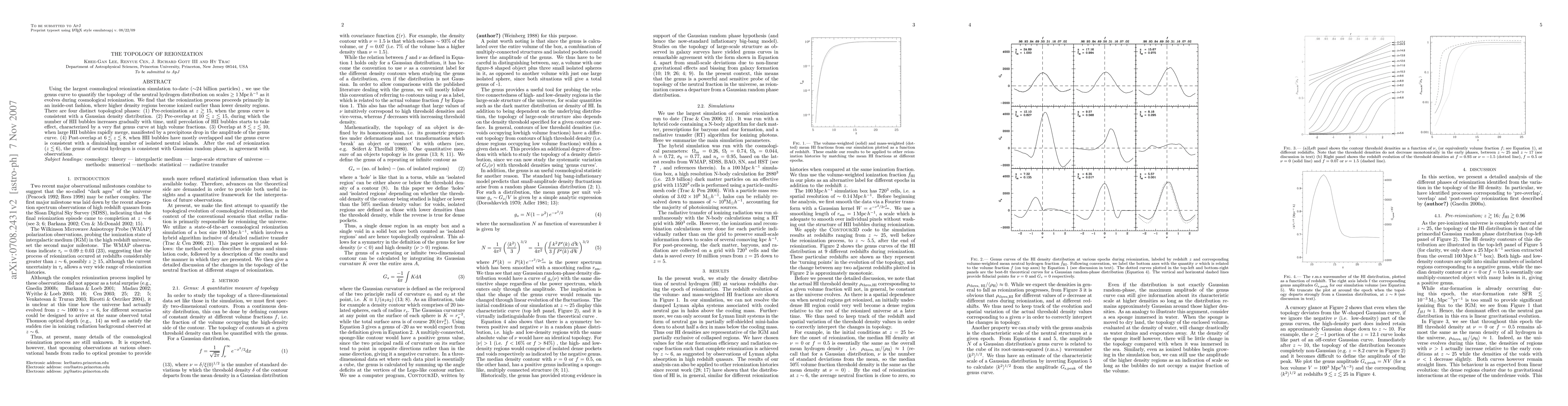 The research utilizes the most extensive cosmological reionization simulation to date, involving 24 billion particles, to analyze the topology of neutral hydrogen distribution during reionization. It identifies four phases: pre-reionization, pre-overlap, overlap, and post-overlap, each marked by distinct genus curve characteristics. The process is found to be inside-out, with higher density regions ionized earlier, aligning with observations post-reionization.