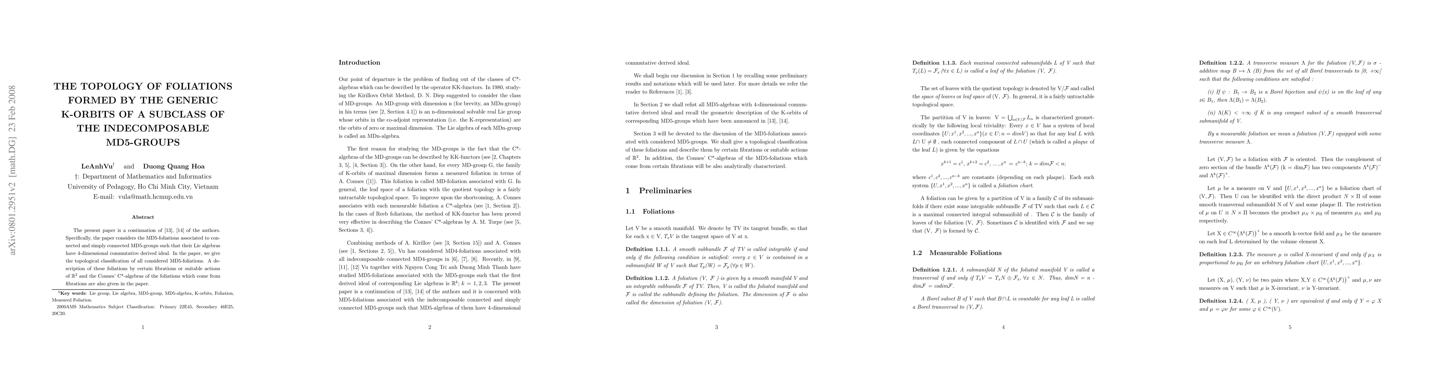 This paper continues previous work on MD5-groups, focusing on foliations formed by their generic K-orbits. It provides a topological classification of these MD5-foliations, describing them via fibrations, $\mathbb{R}^{2}$ actions, and Connes' C*-algebras.