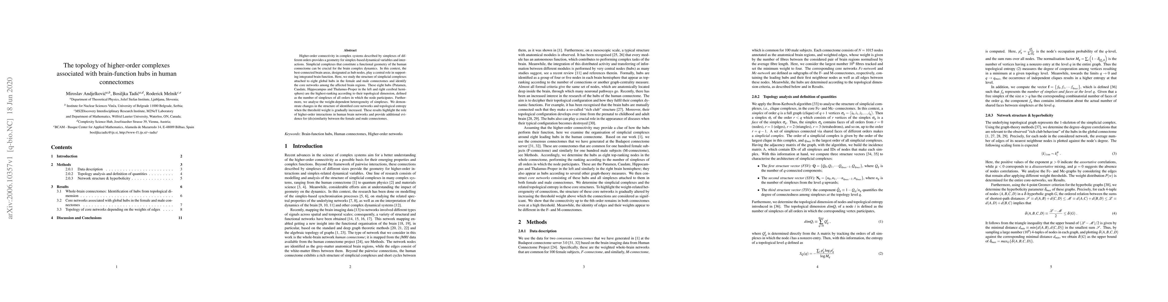 This paper investigates the topology of higher-order simplicial complexes associated with brain-function hubs in human connectomes, focusing on eight key hubs. It identifies core networks and examines how changes in threshold weight affect the structure and topological entropy, highlighting the significance of higher-order interactions and differences between female and male connectomes.