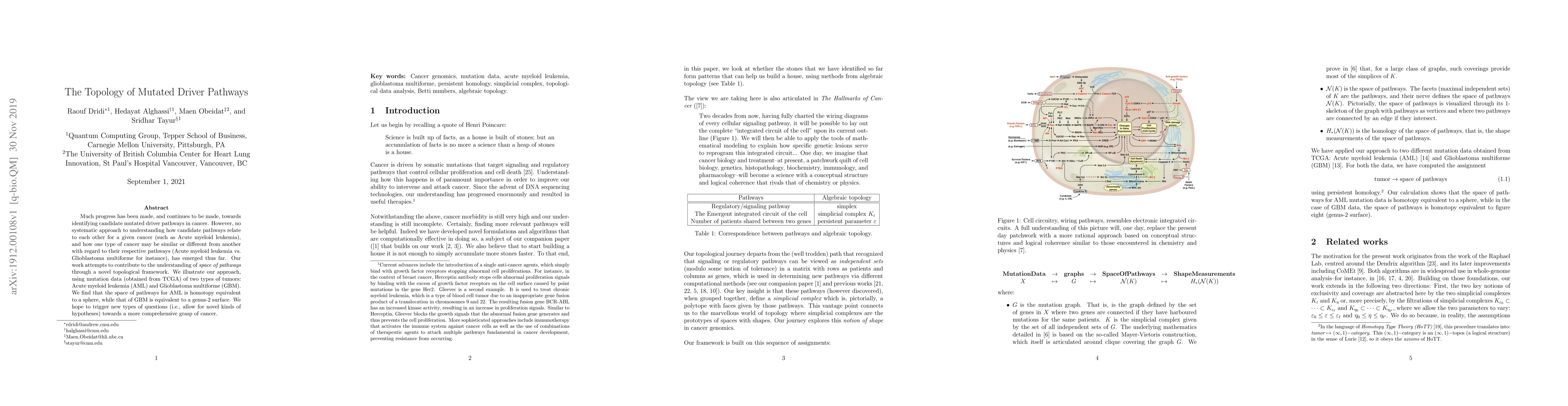 Much progress has been made, and continues to be made, towards identifying candidate mutated driver pathways in cancer. However, no systematic approach to understanding how candidate pathways relate to each other for a given cancer (such as Acute myeloid leukemia), and how one type of cancer may be similar or different from another with regard to their respective pathways (Acute myeloid leukemia vs. Glioblastoma multiforme for instance), has emerged thus far. Our work attempts to contribute to the understanding of {\em space of pathways} through a novel topological framework. We illustrate our approach, using mutation data (obtained from TCGA) of two types of tumors: Acute myeloid leukemia (AML) and Glioblastoma multiforme (GBM). We find that the space of pathways for AML is homotopy equivalent to a sphere, while that of GBM is equivalent to a genus-2 surface. We hope to trigger new types of questions (i.e., allow for novel kinds of hypotheses) towards a more comprehensive grasp of cancer.
