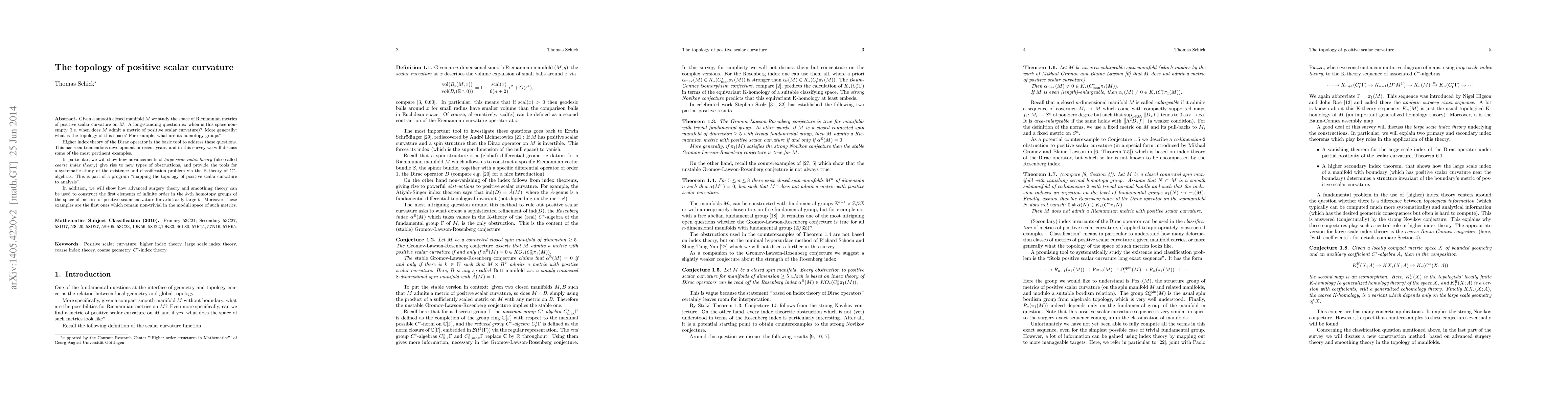 This paper surveys the topology of positive scalar curvature in Riemannian metrics on smooth closed manifolds, employing higher index theory and coarse index theory to identify obstructions and utilize C*-algebra K-theory for existence and classification. It also introduces advanced surgery and smoothing theories to construct elements of infinite order in high homotopy groups, providing the first non-trivial examples in moduli spaces.