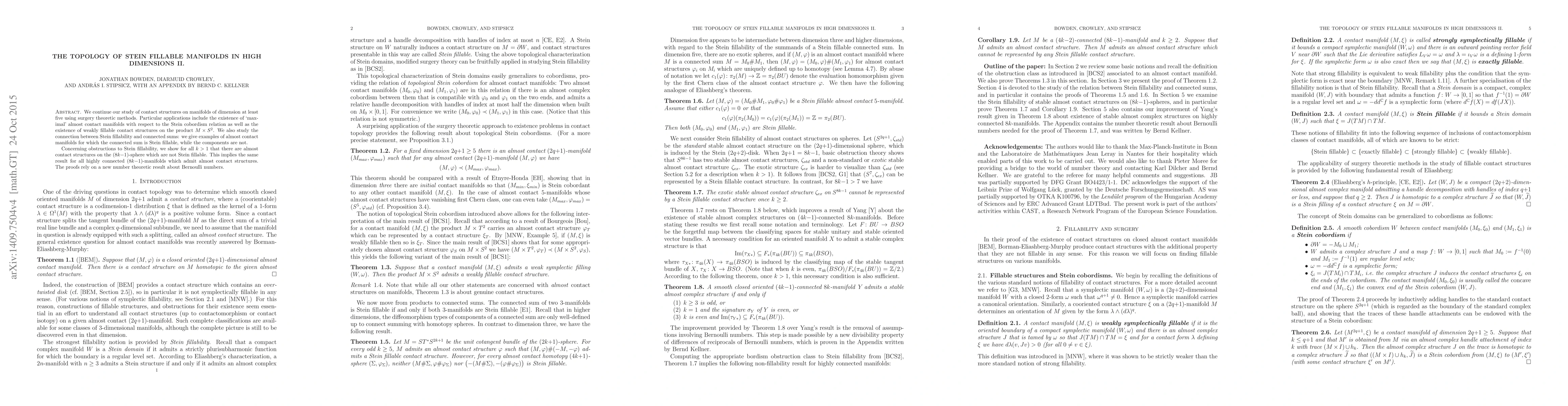 This paper extends the study of Stein fillable manifolds in high dimensions, demonstrating that certain 'maximal' almost contact manifolds are Stein cobordant to any other such manifolds in dimensions greater than three. It also explores the fillable properties of products involving manifolds, highlighting the relationship between Stein fillability and connected sums. The study reveals obstructions for Stein filling in high-dimensional spheres and connected manifolds, supported by a new number-theoretic result on Bernoulli numbers.