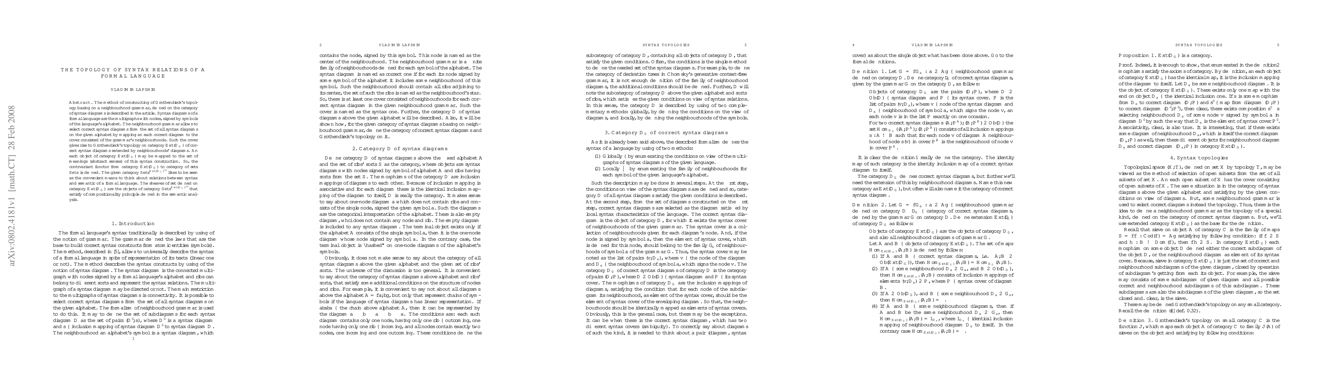 This paper constructs a topology on the category of syntax diagrams using Grothendieck's method based on a neighbourhood grammar, mapping correct syntax diagrams to covers of grammar neighbourhoods. It defines a contravariant functor linking syntax diagrams to sets of meanings, viewing the category of contravariant functors as a means to explore syntax-semantic relations and sheaves as compositional semantic objects.