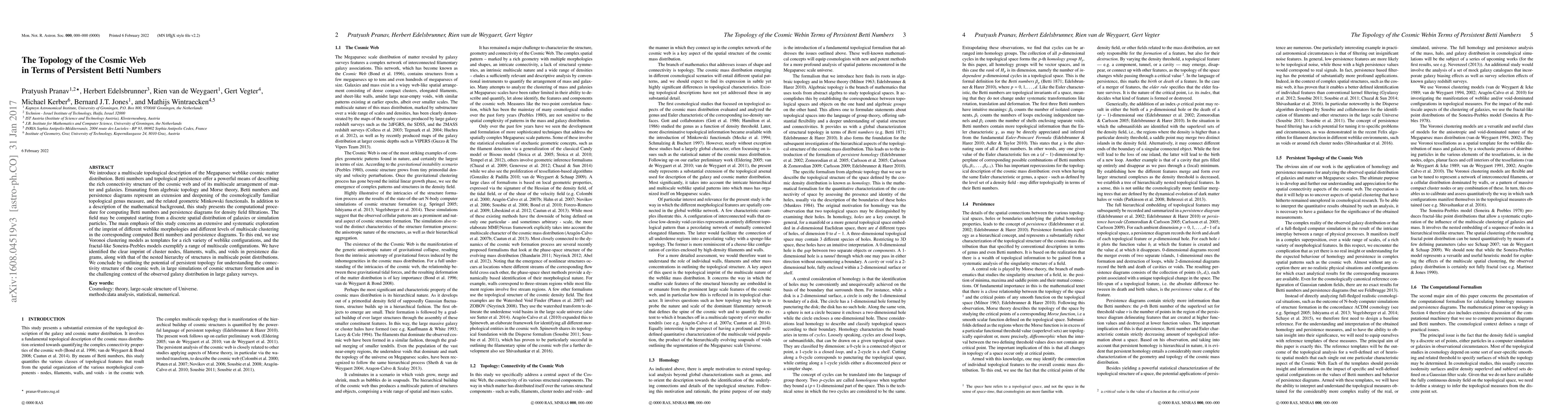 This paper introduces persistent Betti numbers and topological persistence to describe the cosmic web's multiscale structure, revealing the imprint of cosmic web morphologies and clustering levels. The study uses Voronoi and fractal-like models to identify features like filaments and voids, highlighting persistent topology's potential in cosmology.