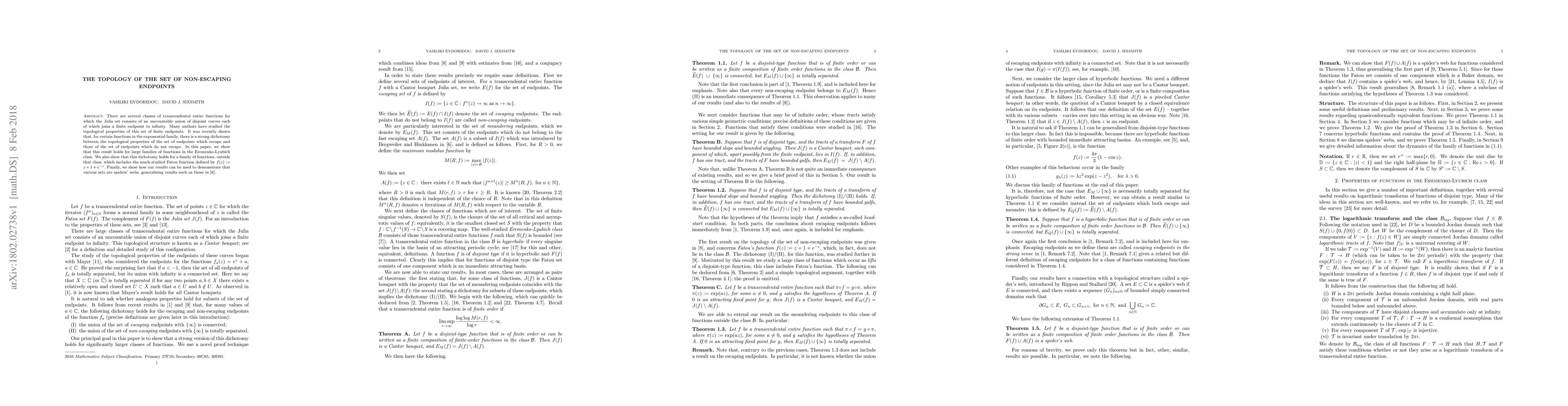 There are several classes of transcendental entire functions for which the Julia set consists of an uncountable union of disjoint curves each of which joins a finite endpoint to infinity. Many authors have studied the topological properties of this set of finite endpoints. It was recently shown that, for certain functions in the exponential family, there is a strong dichotomy between the topological properties of the set of endpoints which escape and those of the set of endpoints which do not escape. In this paper, we show that this result holds for large families of functions in the Eremenko-Lyubich class. We also show that this dichotomy holds for a family of functions, outside that class, which includes the much-studied Fatou function defined by $f(z) := z + 1+ e^{-z}.$ Finally, we show how our results can be used to demonstrate that various sets are spiders' webs, generalising results such as those in a recent paper of the first author.