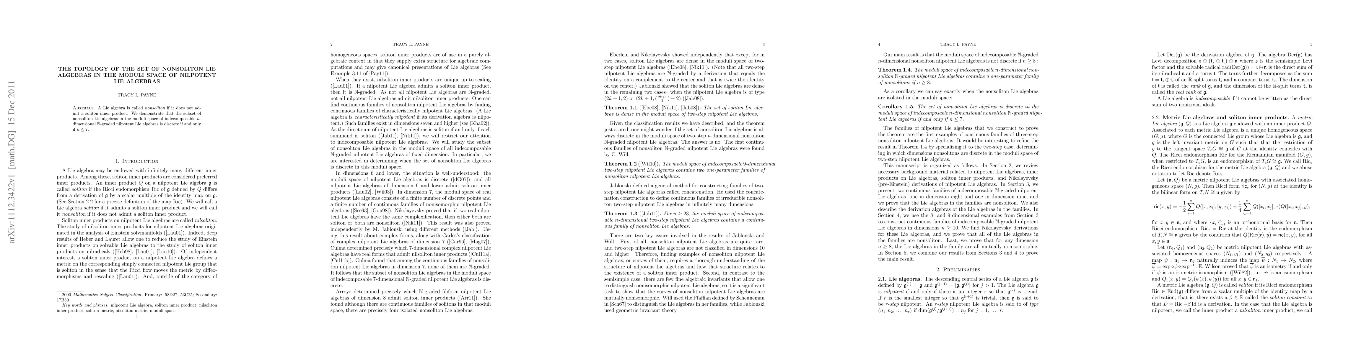 Summary: The paper investigates the topology of nonsoliton Lie algebras within the moduli space of nilpotent Lie algebras, concluding that nonsoliton Lie algebras form a discrete subset only when the dimension of the Lie algebra is seven or less.