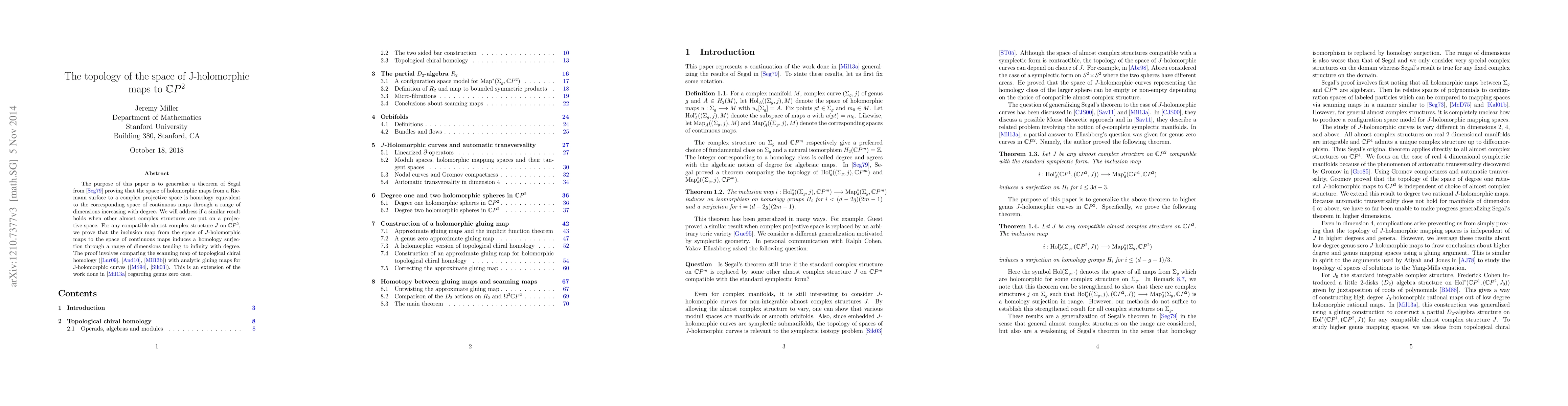 This paper generalizes Segal's theorem on homology equivalence for holomorphic maps to CP^2 under various almost complex structures, proving that the inclusion map induces a homology surjection for J-holomorphic maps, extending previous work on the genus zero case. The proof utilizes comparisons between topological chiral homology and analytic gluing maps for J-holomorphic curves.