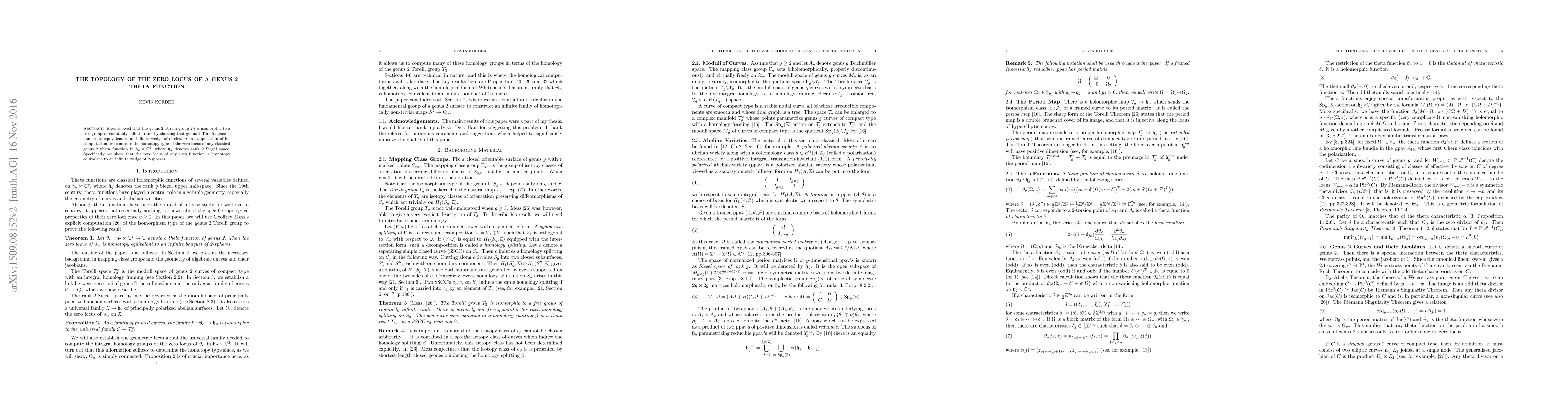 Mess showed that the genus 2 Torelli group $T_2$ is isomorphic to a free group of countably infinite rank by showing that genus 2 Torelli space is homotopy equivalent to an infinite wedge of circles. As an application of his computation, we compute the homotopy type of the zero locus of any classical genus 2 theta function in $\mathfrak{h}_2 \times \mathbb{C}^2$, where $\mathfrak{h}_2$ denotes rank 2 Siegel space. Specifically, we show that the zero locus of any such function is homotopy equivalent to an infinite wedge of 2-spheres.