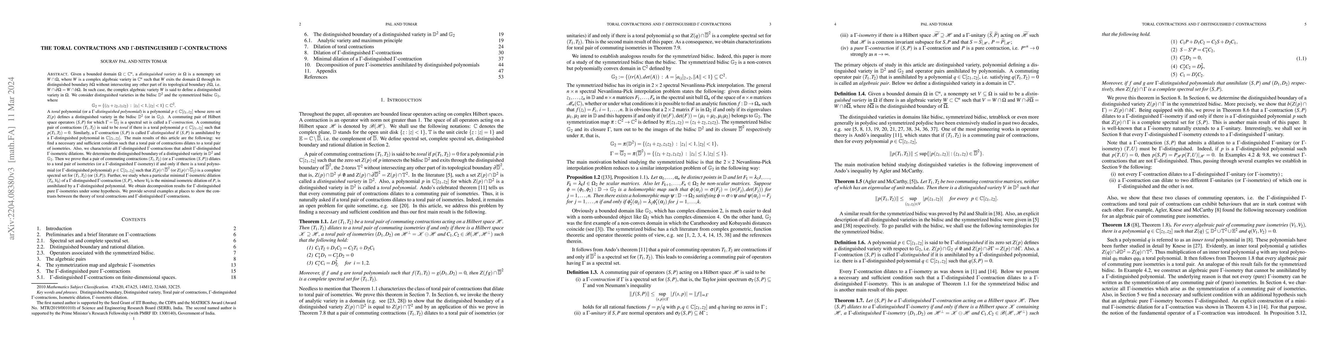 The paper presents detailed characterizations and proofs related to the spectral properties and dilations of toral contractions and $\Gamma$-distinguished $\Gamma$-contractions, extending previous work in the field.