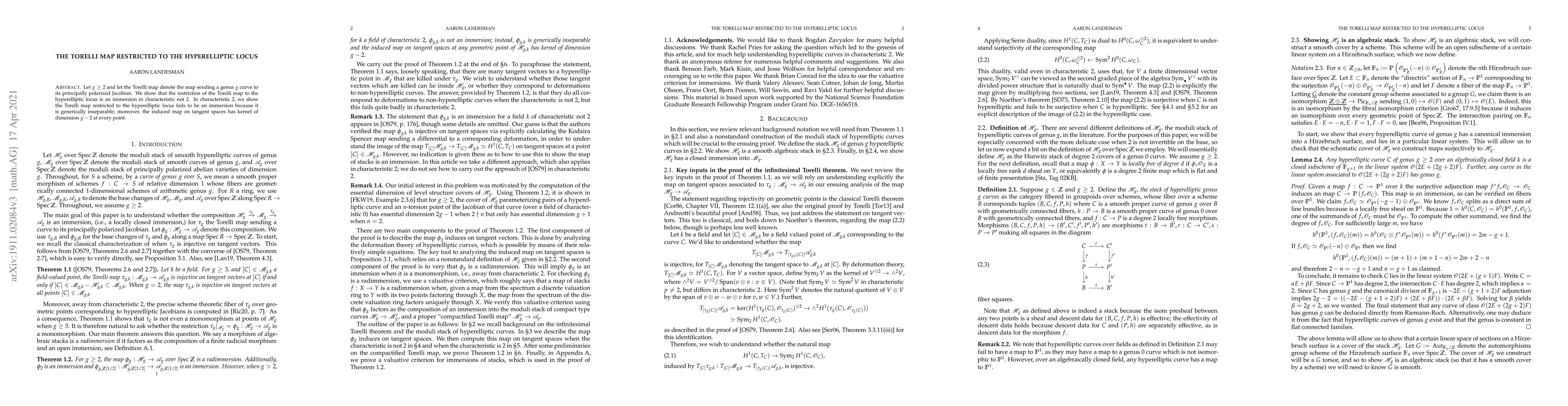 Summary: The Torelli map restricts to an immersion in characteristic not 2 for hyperelliptic curves, but in characteristic 2, it fails to be an immersion due to generic inseparability, with a tangent space kernel of dimension $g-2$.