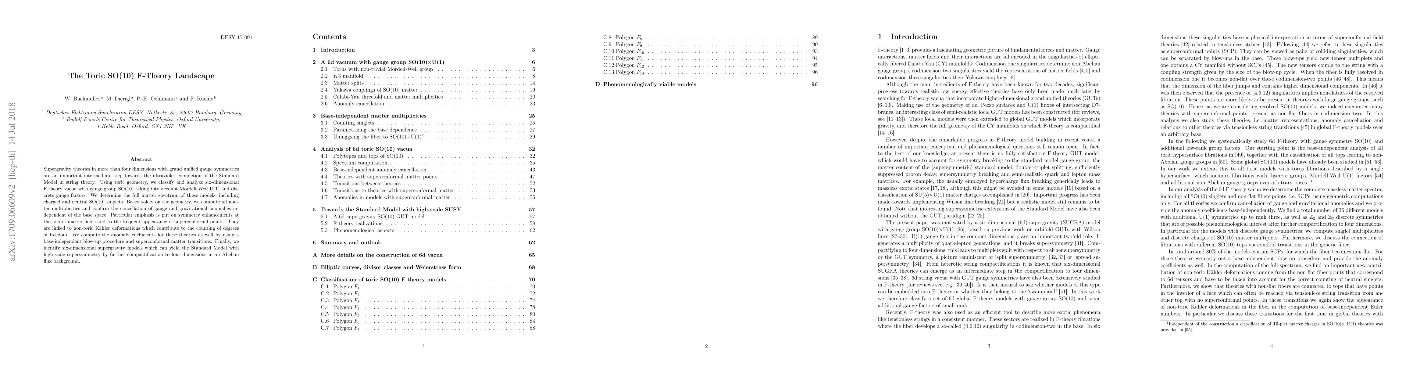 Supergravity theories in more than four dimensions with grand unified gauge symmetries are an important intermediate step towards the ultraviolet completion of the Standard Model in string theory. Using toric geometry, we classify and analyze six-dimensional F-theory vacua with gauge group SO(10) taking into account Mordell-Weil U(1) and discrete gauge factors. We determine the full matter spectrum of these models, including charged and neutral SO(10) singlets. Based solely on the geometry, we compute all matter multiplicities and confirm the cancellation of gauge and gravitational anomalies independent of the base space. Particular emphasis is put on symmetry enhancements at the loci of matter fields and to the frequent appearance of superconformal points. They are linked to non-toric K\"ahler deformations which contribute to the counting of degrees of freedom. We compute the anomaly coefficients for these theories as well by using a base-independent blow-up procedure and superconformal matter transitions. Finally, we identify six-dimensional supergravity models which can yield the Standard Model with high-scale supersymmetry by further compactification to four dimensions in an Abelian flux background.