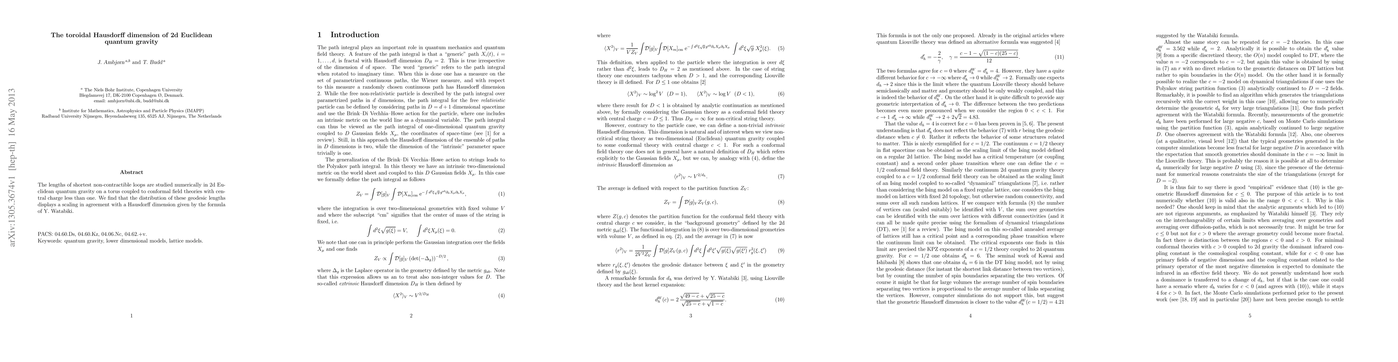 This paper numerically investigates the lengths of shortest non-contractible loops in 2d Euclidean quantum gravity on a torus, revealing a scaling behavior that aligns with a Hausdorff dimension formula proposed by Y. Watabiki. The study focuses on conformal field theories with central charges less than one.
