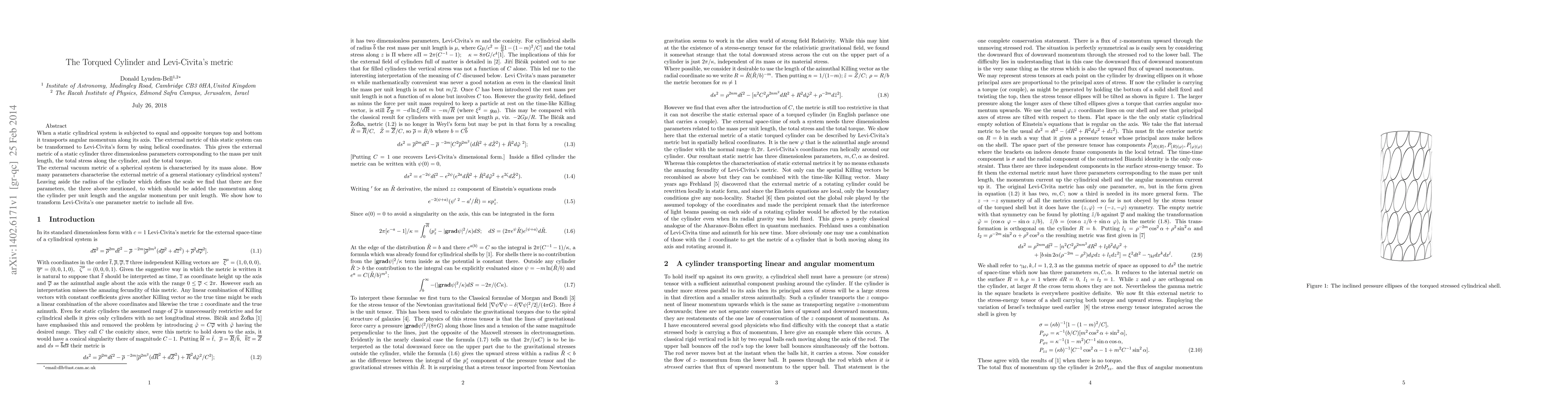 When a static cylindrical system is subjected to equal and opposite torques top and bottom it transports angular momentum along its axis. The external metric of this static system can be transformed to Levi-Civita's form by using helical coordinates. This gives the external metric of a static cylinder three dimensionless parameters corresponding to the mass per unit length, the total stress along the cylinder, and the total torque. The external vacuum metric of a spherical system is characterised by its mass alone. How many parameters characterise the external metric of a general stationary cylindrical system? Leaving aside the radius of the cylinder which defines the scale we find that there are five parameters, the three above mentioned, to which should be added the momentum along the cylinder per unit length and the angular momentum per unit length. We show how to transform Levi-Civita's one parameter metric to include all five.