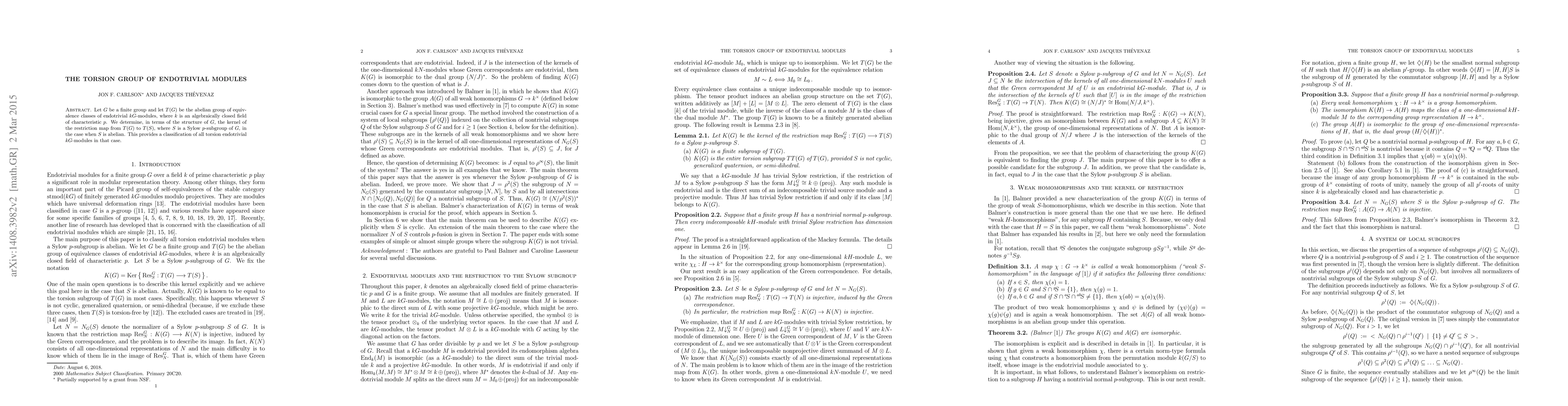 This paper classifies the torsion endotrivial kG-modules for a finite group G when its abelian Sylow p-subgroup S restricts the kernel of the map from T(G) to T(S). The result is determined in terms of the structure of G.