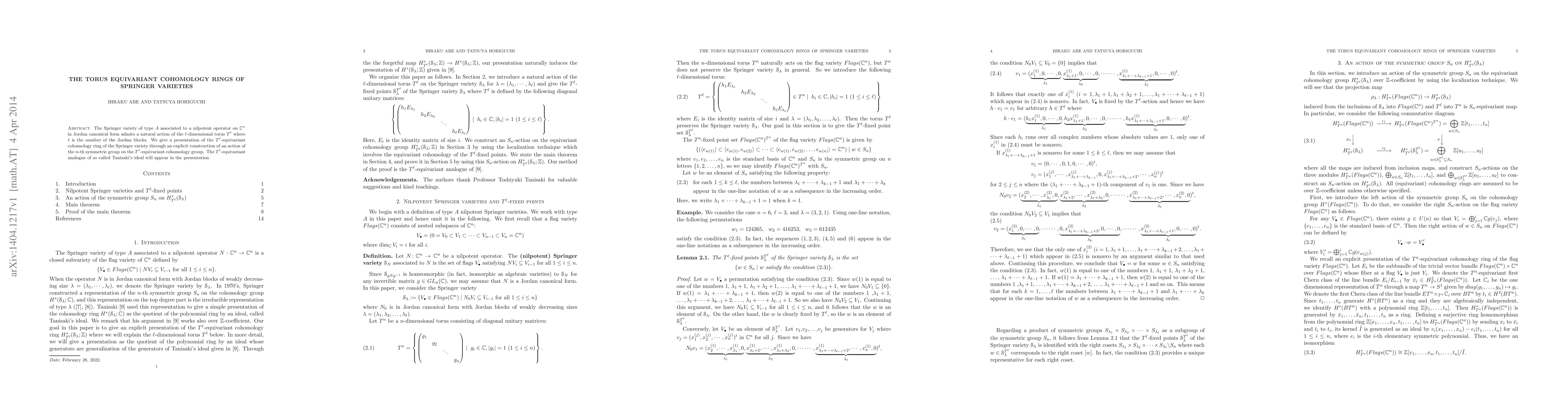 The Springer variety of type $A$ associated to a nilpotent operator on $\mathbb{C}^n$ in Jordan canonical form admits a natural action of the $\ell$-dimensional torus $T^{\ell}$ where $\ell$ is the number of the Jordan blocks. We give a presentation of the $T^{\ell}$-equivariant cohomology ring of the Springer variety through an explicit construction of an action of the $n$-th symmetric group on the $T^{\ell}$-equivariant cohomology group. The $T^{\ell}$-equivariant analogue of so called Tanisaki's ideal will appear in the presentation.