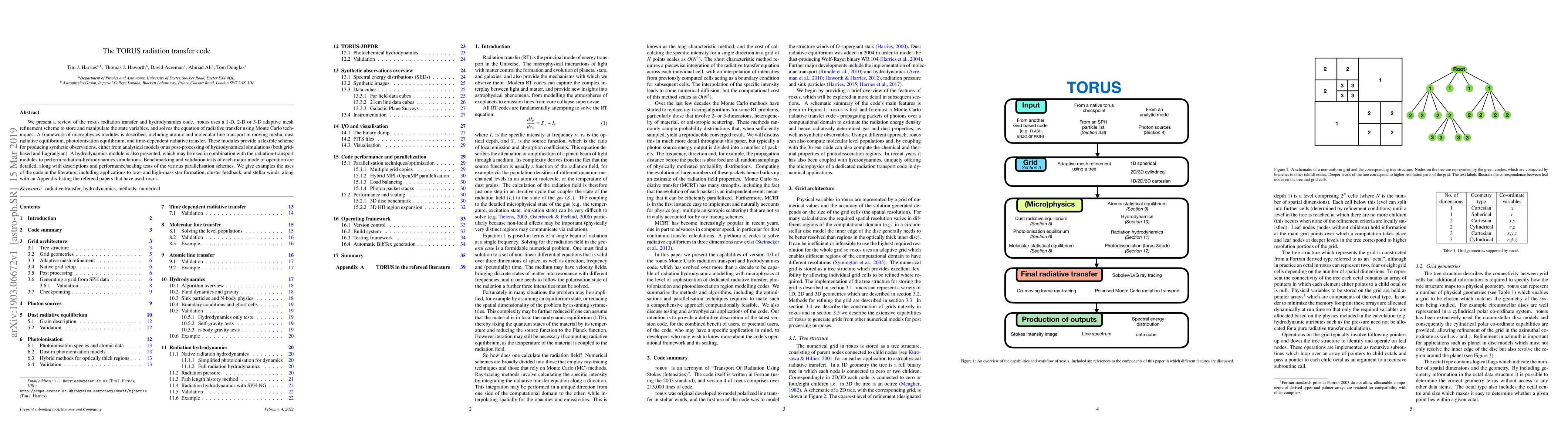 TORUS is a radiation transfer and hydrodynamics code that uses adaptive mesh refinement and Monte Carlo techniques to simulate complex astrophysical phenomena. It provides flexible schemes for producing synthetic observations and can be used for various applications in star formation, cluster feedback, and stellar winds.