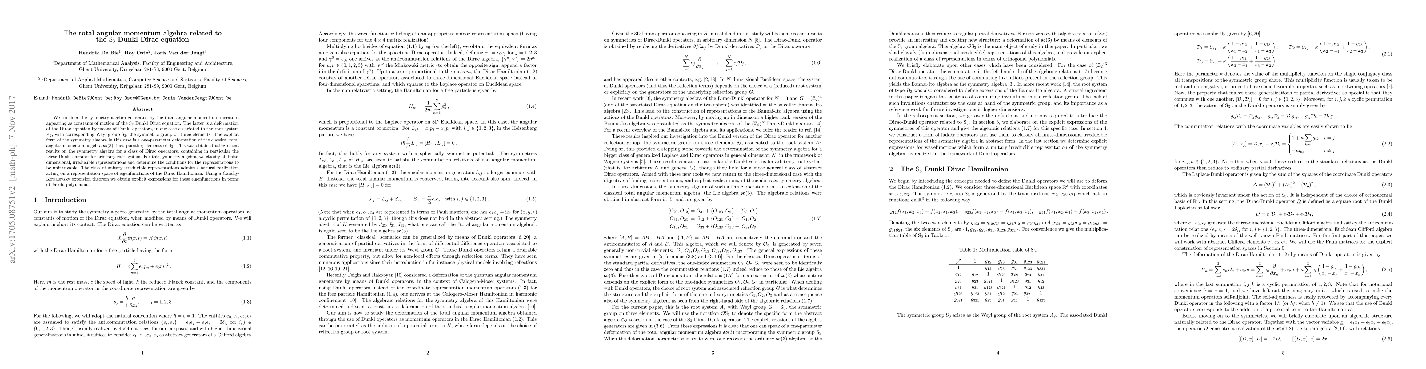 We consider the symmetry algebra generated by the total angular momentum operators, appearing as constants of motion of the $\mathrm{S}_3$ Dunkl Dirac equation. The latter is a deformation of the Dirac equation by means of Dunkl operators, in our case associated to the root system $A_2$, with corresponding Weyl group $\mathrm{S}_3$, the symmetric group on three elements. The explicit form of the symmetry algebra in this case is a one-parameter deformation of the classical total angular momentum algebra $\mathfrak{so}(3)$, incorporating elements of $\mathrm{S}_3$. This was obtained using recent results on the symmetry algebra for a class of Dirac operators, containing in particular the Dirac-Dunkl operator for arbitrary root system. For this symmetry algebra, we classify all finite-dimensional, irreducible representations and determine the conditions for the representations to be unitarizable. The class of unitary irreducible representations admits a natural realization acting on a representation space of eigenfunctions of the Dirac Hamiltonian. Using a Cauchy-Kowalevsky extension theorem we obtain explicit expressions for these eigenfunctions in terms of Jacobi polynomials.