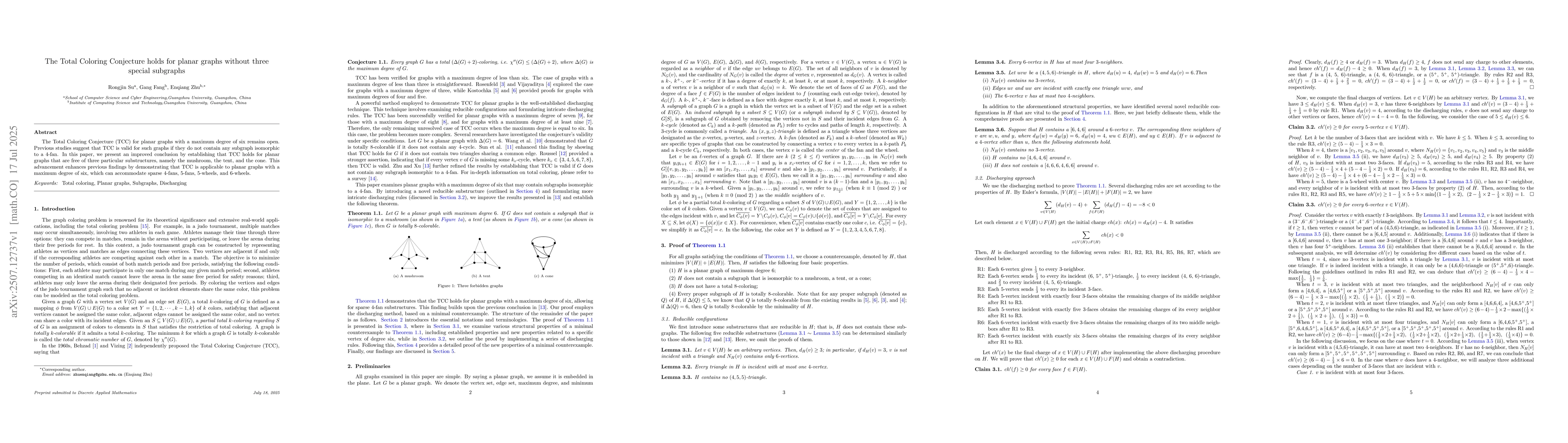 The Total Coloring Conjecture (TCC) for planar graphs with a maximum degree of six remains open. Previous studies suggest that TCC is valid for such graphs if they do not contain any subgraph isomorphic to a 4-fan. In this paper, we present an improved conclusion by establishing that TCC holds for planar graphs that are free of three particular substructures, namely the mushroom, the tent, and the cone. This advancement enhances previous findings by demonstrating that TCC is applicable to planar graphs with a maximum degree of six, which can accommodate sparse 4-fans, 5-fans, 5-wheels, and 6-wheels.