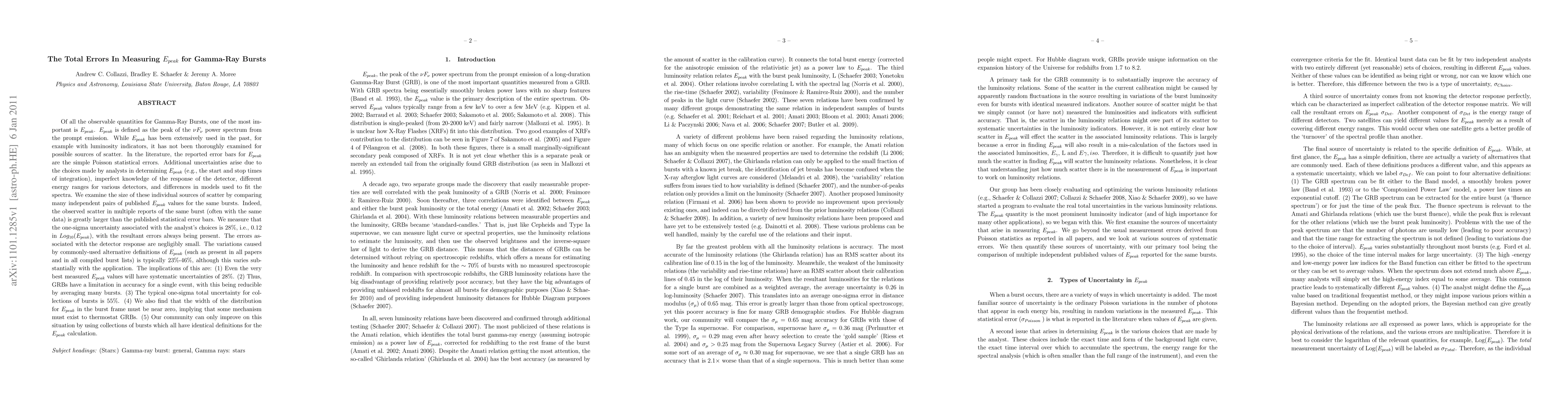 While Epeak has been extensively used in the past, for example with luminosity indicators, it has not been thoroughly examined for possible sources of scatter. In the literature, the reported error bars for Epeak are the simple Poisson statistical errors. Additional uncertainties arise due to the choices made by analysts in determining Epeak (e.g., the start and stop times of integration), imperfect knowledge of the response of the detector, different energy ranges for various detectors, and differences in models used to fit the spectra. We examine the size of these individual sources of scatter by comparing many independent pairs of published Epeak values for the same bursts. Indeed, the observed scatter in multiple reports of the same burst (often with the same data) is greatly larger than the published statistical error bars. We measure that the one-sigma uncertainty associated with the analyst's choices is 28%, i.e., 0.12 in Log10(Epeak), with the resultant errors always being present. The errors associated with the detector response are negligibly small. The variations caused by commonly-used alternative definitions of Epeak (such as present in all papers and in all compiled burst lists) is typically 23%-46%, although this varies substantially with the application. The implications of this are: (1) Even the very best measured Epeak values will have systematic uncertainties of 28%. (2) Thus, GRBs have a limitation in accuracy for a single event, with this being reducible by averaging many bursts. (3) The typical one-sigma total uncertainty for collections of bursts is 55%. (4) We also find that the width of the distribution for Epeak in the burst frame must be near zero, implying that some mechanism must exist to thermostat GRBs. (5) Our community can only improve on this situation by using collections of bursts which all have identical definitions for the Epeak calculation.