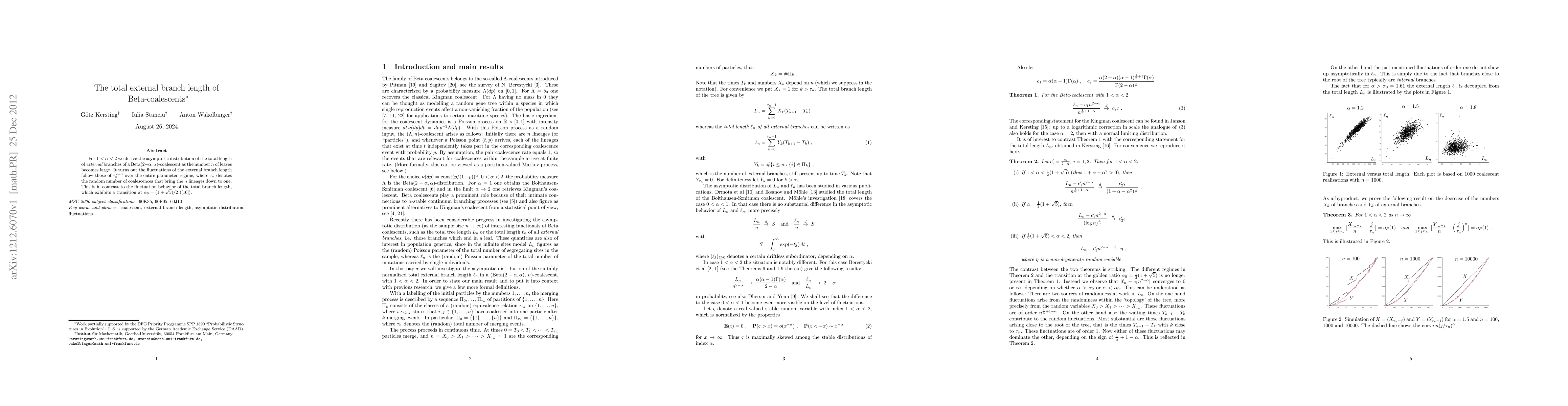 For $1<\alpha <2$ we derive the asymptotic distribution of the total length of {\em external} branches of a Beta$(2-\alpha, \alpha)$-coalescent as the number $n$ of leaves becomes large. It turns out the fluctuations of the external branch length follow those of $\tau_n^{2-\alpha}$ over the entire parameter regime, where $\tau_n$ denotes the random number of coalescences that bring the $n$ lineages down to one. This is in contrast to the fluctuation behavior of the total branch length, which exhibits a transition at $\alpha_0 = (1+\sqrt 5)/2$.