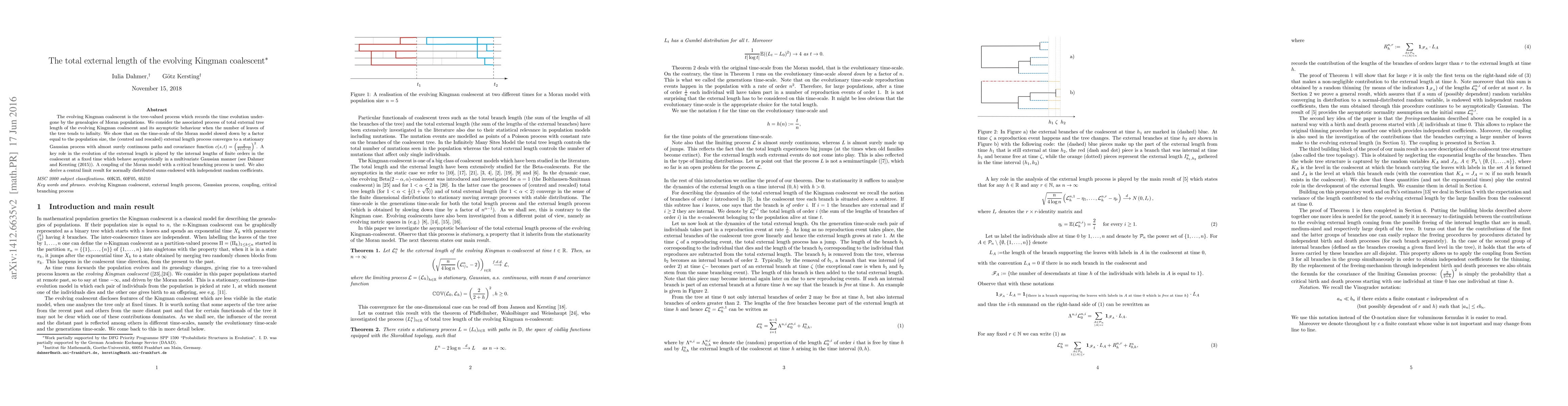This paper studies the evolving Kingman coalescent, focusing on the total external tree length process and its asymptotic behavior. It demonstrates that the rescaled external length converges to a continuous Gaussian process, with a specific covariance function, revealing the role of internal lengths in the coalescent's evolution.