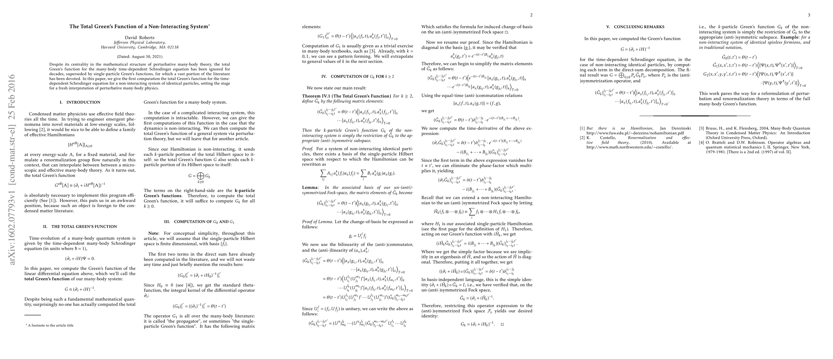Despite its centrality in the mathematical structure of perturbative many-body theory, the total Green's function for the many-body time-dependent Schrodinger equation has been ignored for decades, superseded by single-particle Green's functions, for which a vast portion of the literature has been devoted. In this paper, we give the first computation the total Green's function for the time-dependent Schrodinger equation for a non-interacting system of identical particles, setting the stage for a fresh interpretation of perturbative many-body physics.