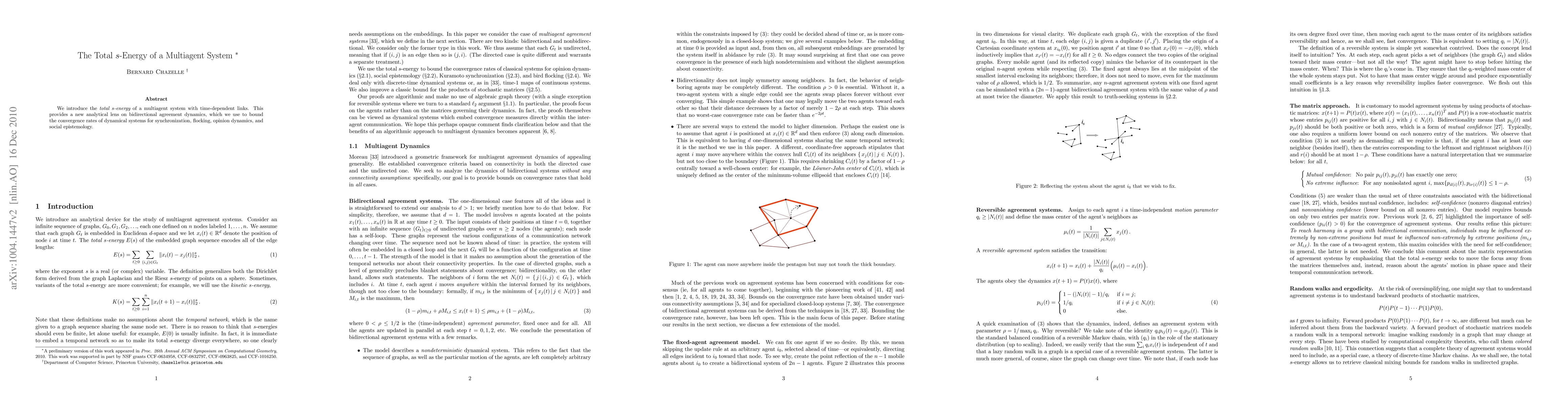 We introduce the "total s-energy" of a multiagent system with time-dependent links. This provides a new analytical lens on bidirectional agreement dynamics, which we use to bound the convergence rates of dynamical systems for synchronization, flocking, opinion dynamics, and social epistemology.