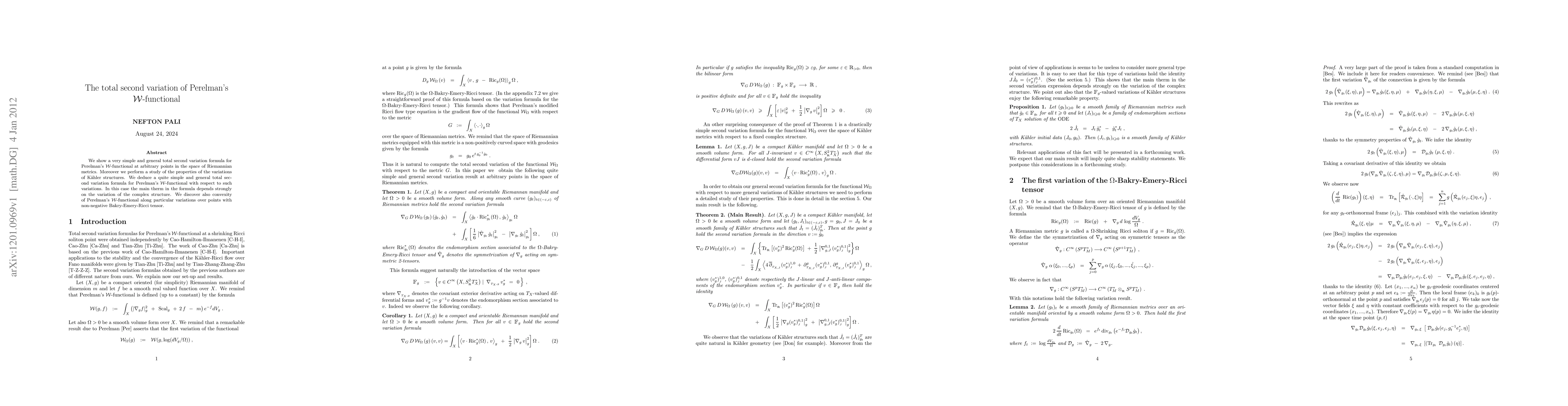We show a very simple and general total second variation formula for Perelman's $\mathcal{W}$-functional at arbitrary points in the space of Riemannian metrics. Moreover we perform a study of the properties of the variations of K\"ahler structures. We deduce a quite simple and general total second variation formula for Perelman's $\mathcal{W}$-functional with respect to such variations. In this case the main therm in the formula depends strongly on the variation of the complex structure. We discover also convexity of Perelman's $\mathcal{W}$-functional along particular variations over points with non-negative Bakry-Emery-Ricci tensor.