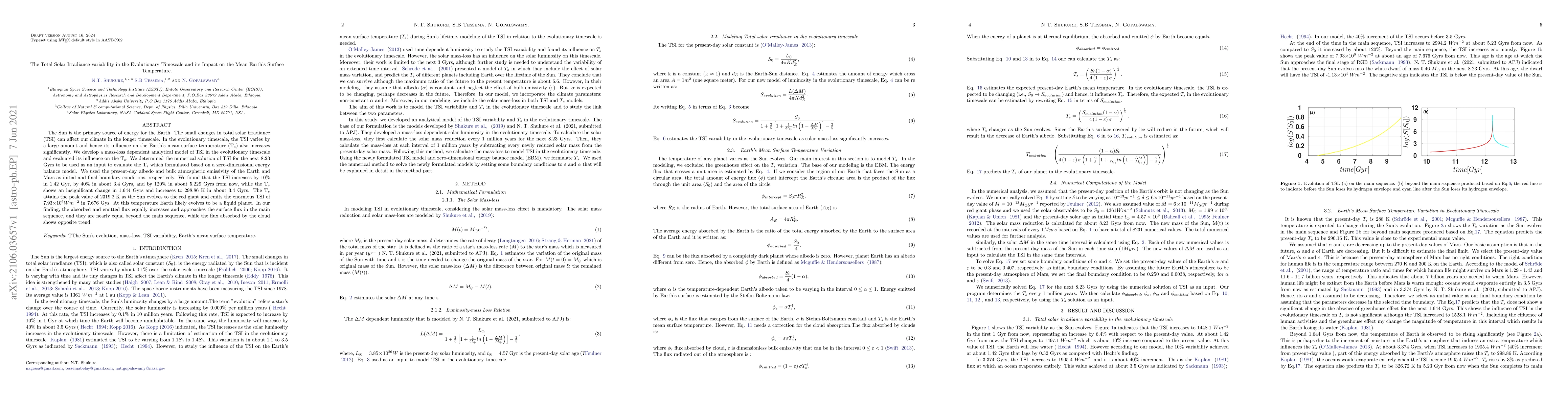 The Sun is the primary source of energy for the Earth. The small changes in total solar irradiance (TSI) can affect our climate in the longer timescale. In the evolutionary timescale, the TSI varies by a large amount and hence its influence on the Earth's mean surface temperature (T$_{s}$) also increases significantly. We develop a mass-loss dependent analytical model of TSI in the evolutionary timescale and evaluated its influence on the T$_{s}$. We determined the numerical solution of TSI for the next 8.23 Gyrs to be used as an input to evaluate the T$_{s}$ which formulated based on a zero-dimensional energy balance model. We used the present-day albedo and bulk atmospheric emissivity of the Earth and Mars as initial and final boundary conditions, respectively. We found that the TSI increases by 10\% in 1.42 Gyr, by 40\% in about 3.4 Gyrs, and by 120\% in about 5.229 Gyrs from now, while the T$_{s}$ shows an insignificant change in 1.644 Gyrs and increases to 298.86 K in about 3.4 Gyrs. The T$_{s}$ attains the peak value of 2319.2 K as the Sun evolves to the red giant and emits the enormous TSI of 7.93$\times10^{6} Wm^{-2}$ in 7.676 Gys. At this temperature Earth likely evolves to be a liquid planet. In our finding, the absorbed and emitted flux equally increases and approaches the surface flux in the main sequence, and they are nearly equal beyond the main sequence, while the flux absorbed by the cloud shows opposite trend.