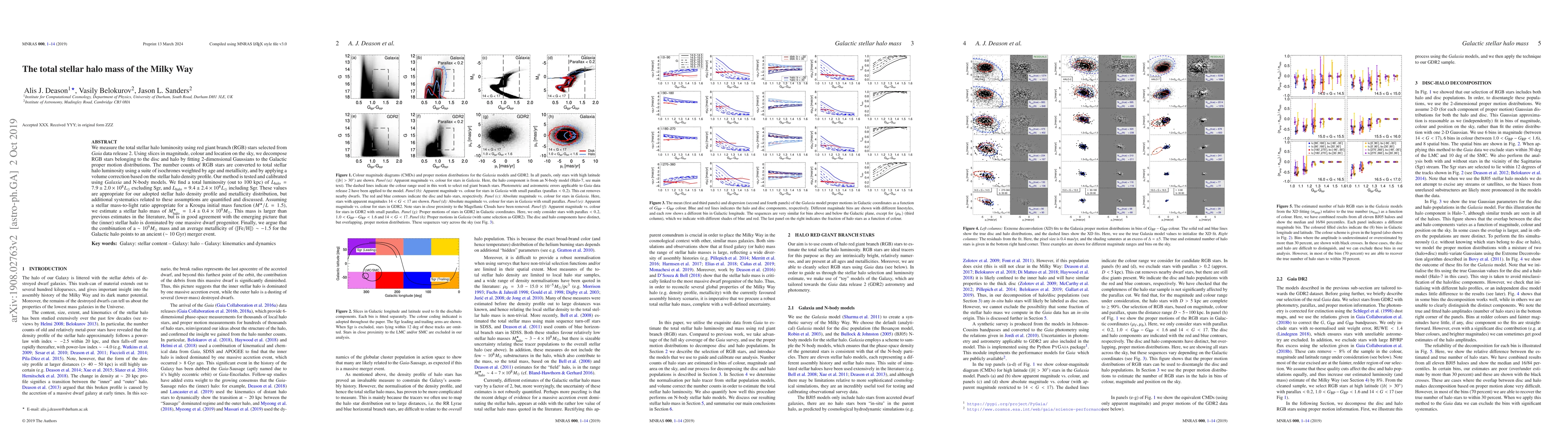 The Milky Way's total stellar halo mass is estimated to be approximately 1.4 x 10^9 M_Sun, with a range of 1.0-2.3 x 10^9 M_Sun, using Gaia data and isochrone models, suggesting an ancient merger event around 10 Gyr ago.