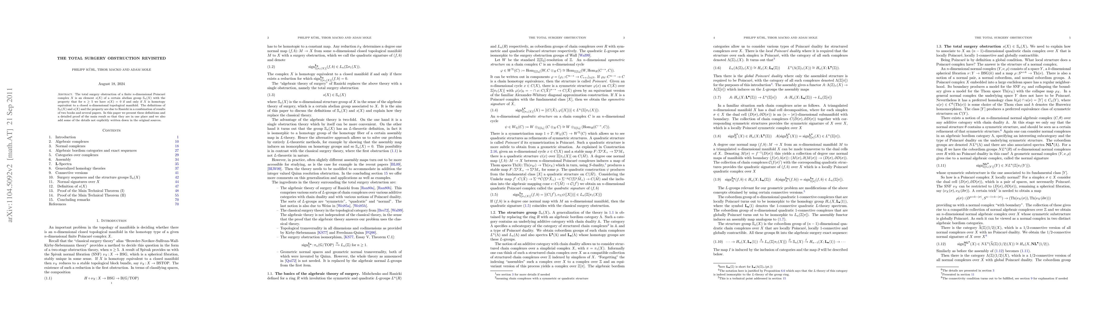 The total surgery obstruction of a finite n-dimensional Poincare complex X is an element s(X) of a certain abelian group S_n (X) with the property that for n >= 5 we have s(X) = 0 if and only if X is homotopy equivalent to a closed n-dimensional topological manifold. The definitions of S_n (X) and s(X) and the property are due to Ranicki in a combination of results of two books and several papers. In this paper we present these definitions and a detailed proof of the main result so that they are in one place and we also add some of the details not explicitly written down in the original sources.