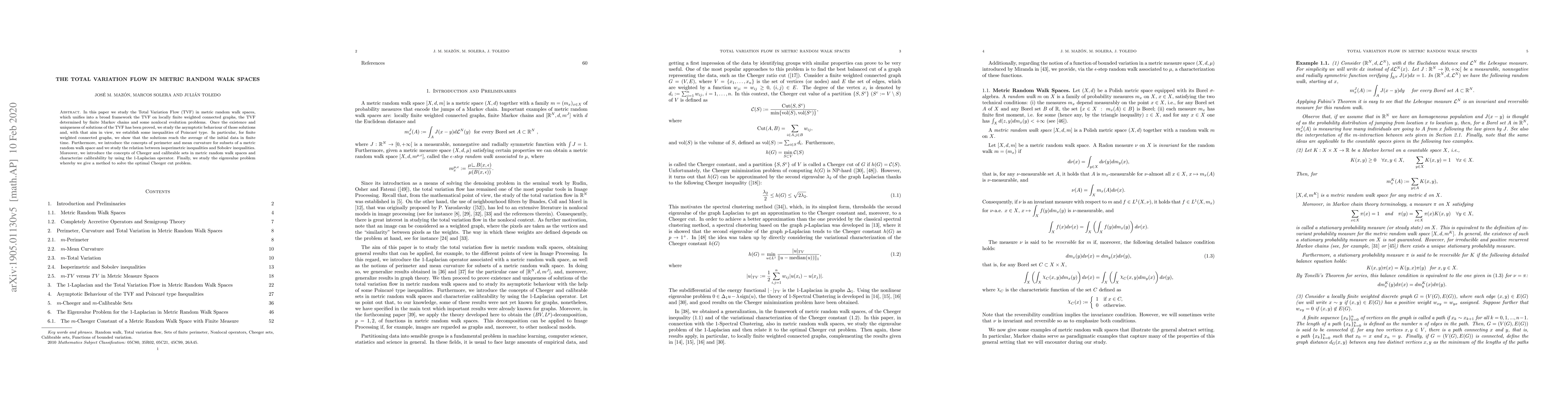 This paper explores the Total Variation Flow (TVF) in metric random walk spaces, proving its existence and uniqueness, and studying its asymptotic behavior. It introduces concepts like perimeter, mean curvature, and Cheeger sets, and provides a method to solve the optimal Cheeger cut problem.