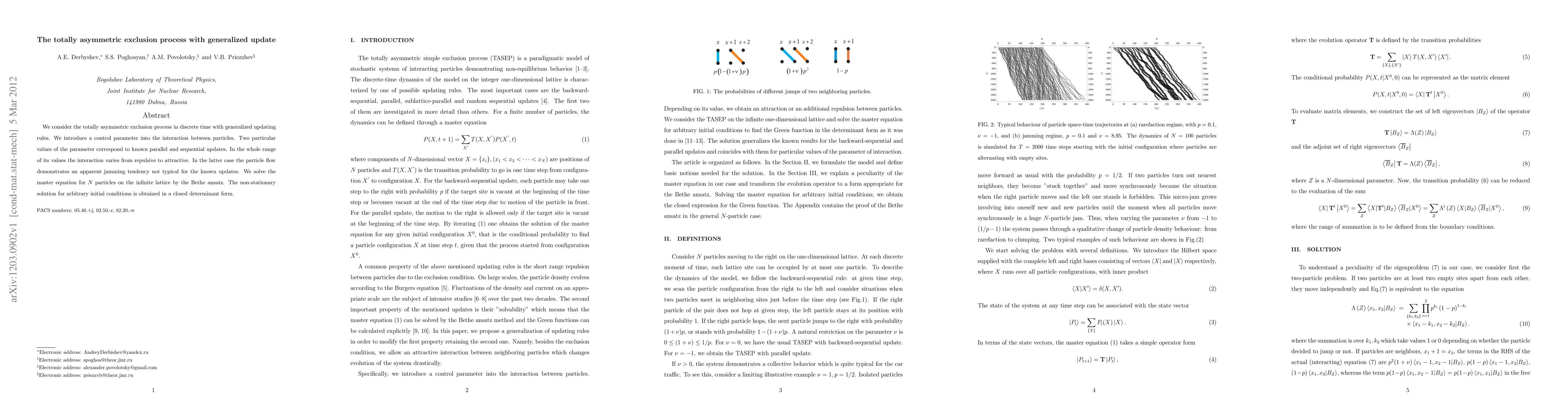 This paper studies the totally asymmetric exclusion process with generalized updating rules, introducing a control parameter that varies interactions from repulsive to attractive. The authors solve the master equation using the Bethe ansatz, obtaining a closed determinant form for the non-stationary solution under arbitrary initial conditions.