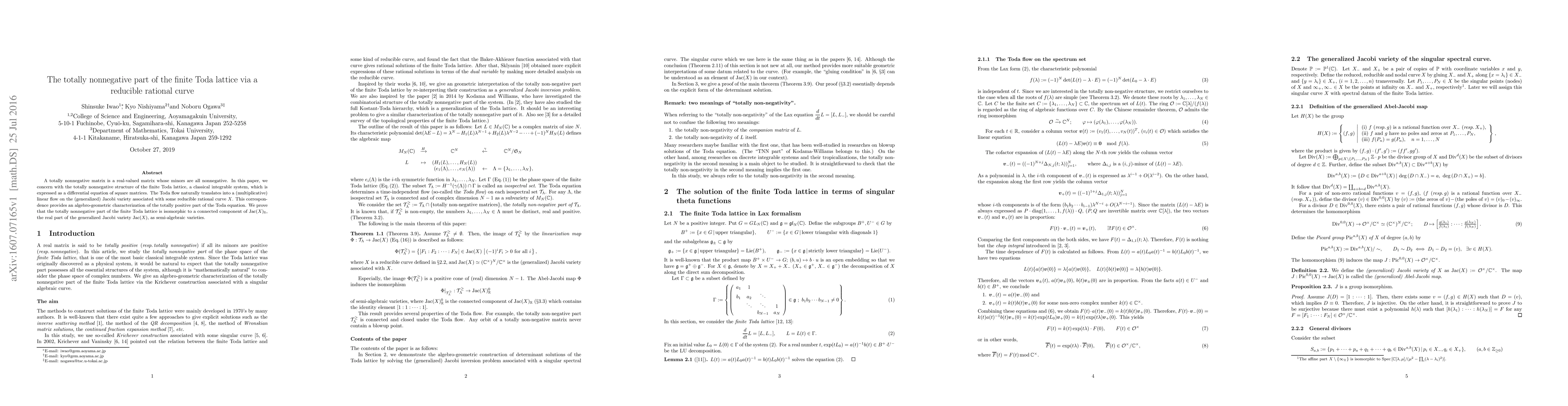 The paper uses the theory of integrable systems, specifically the Toda lattice, and connects it to algebraic geometry via a reducible rational curve, characterizing the totally nonnegative part of the finite Toda lattice through a linear flow on the Jacobi variety.