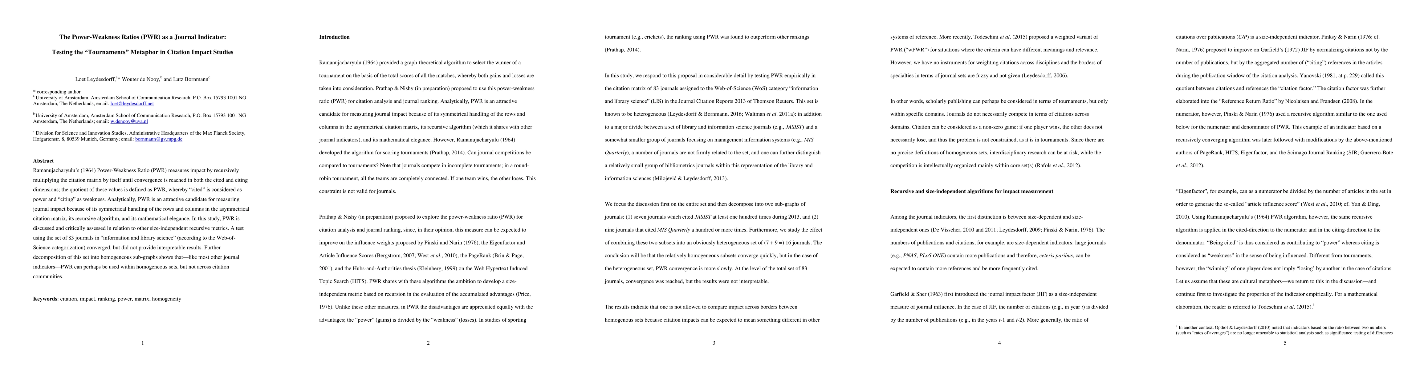 Ramanujacharyulu's (1964) Power-Weakness Ratio (PWR) measures impact by recursively multiplying the citation matrix by itself until convergence is reached in both the cited and citing dimensions; the quotient of these values is defined as PWR, whereby "cited" is considered as power and "citing" as weakness. Analytically, PWR is an attractive candidate for measuring journal impact because of its symmetrical handling of the rows and columns in the asymmetrical citation matrix, its recursive algorithm, and its mathematical elegance. In this study, PWR is discussed and critically assessed in relation to other size-independent recursive metrics. A test using the set of 83 journals in "information and library science" (according to the Web-of-Science categorization) converged, but did not provide interpretable results. Further decomposition of this set into homogeneous sub-graphs shows that--like most other journal indicators--PWR can perhaps be used within homogeneous sets, but not across citation communities.