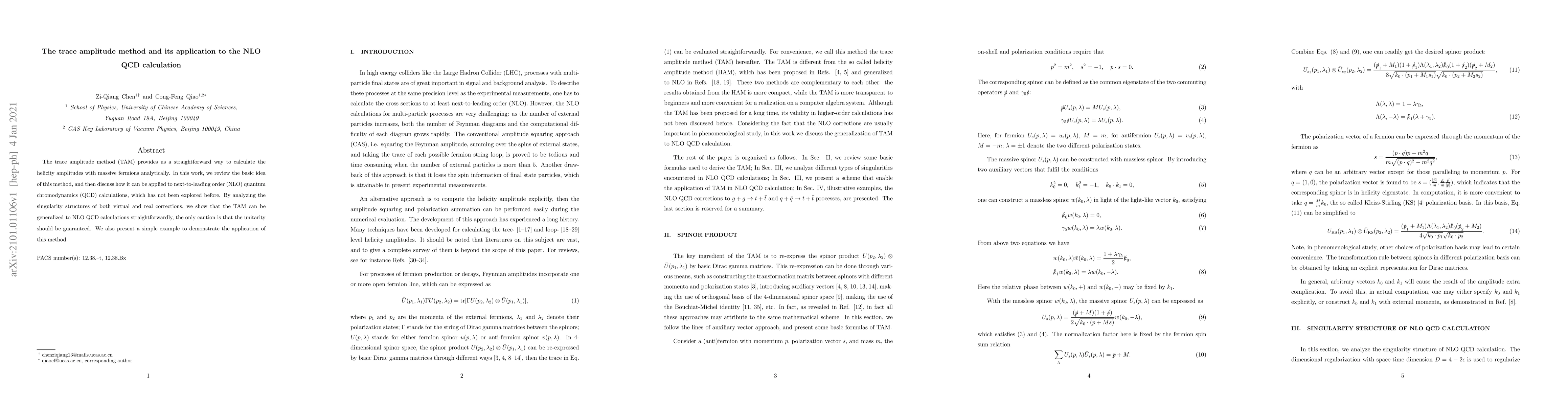 The trace amplitude method (TAM) provides us a straightforward way to calculate the helicity amplitudes with massive fermions analytically. In this work, we review the basic idea of this method, and then discuss how it can be applied to next-to-leading order (NLO) quantum chromodynamics (QCD) calculations, which has not been explored before. By analyzing the singularity structures of both virtual and real corrections, we show that the TAM can be generalized to NLO QCD calculations straightforwardly, the only caution is that the unitarity should be guaranteed. We also present a simple example to demonstrate the application of this method.