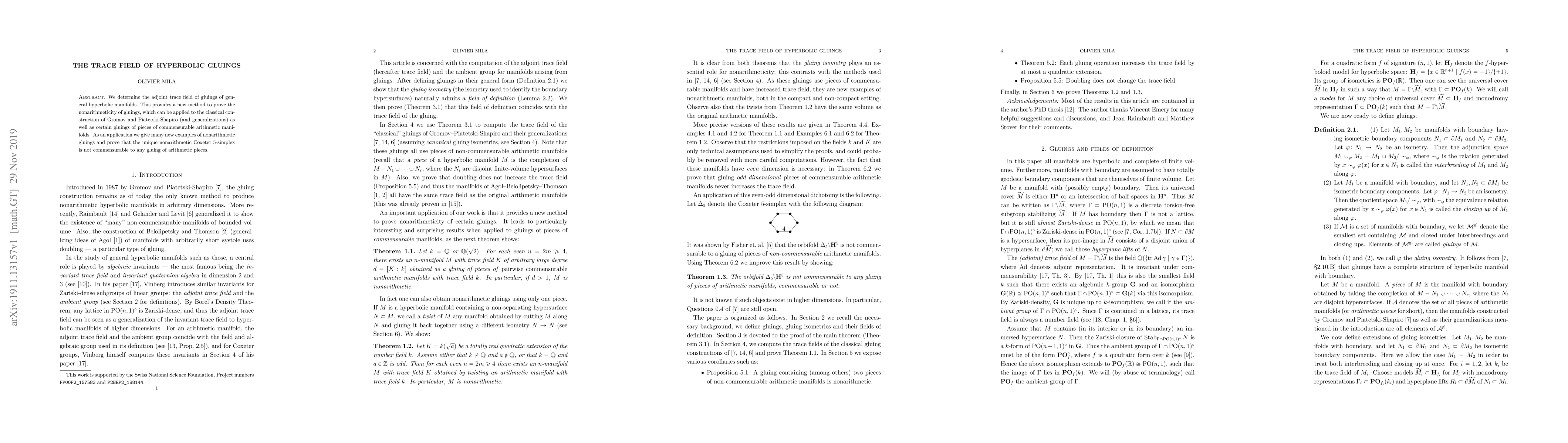 We determine the adjoint trace field of gluings of general hyperbolic manifolds. This provides a new method to prove the nonarithmeticity of gluings, which can be applied to the classical construction of Gromov and Piatetski-Shapiro (and generalizations) as well as certain gluings of pieces of commensurable arithmetic manifolds. As an application we give many new examples of nonarithmetic gluings and prove that the unique nonarithmetic Coxeter 5-simplex is not commensurable to any gluing of arithmetic pieces.