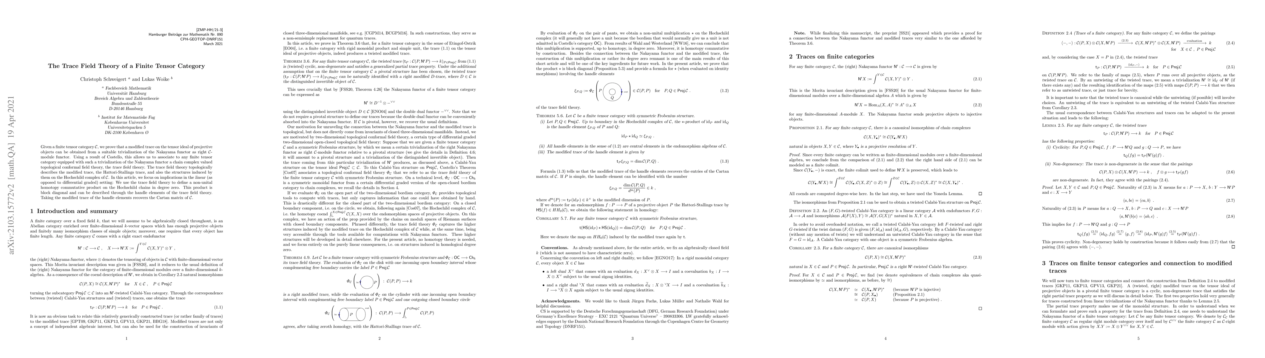 This paper establishes a connection between finite tensor categories and trace field theory, showing how a modified trace can be derived from a trivialization of the Nakayama functor. It introduces a non-unital homotopy commutative product on the Hochschild chains, which is linked to the Cartan matrix via the trace field theory.