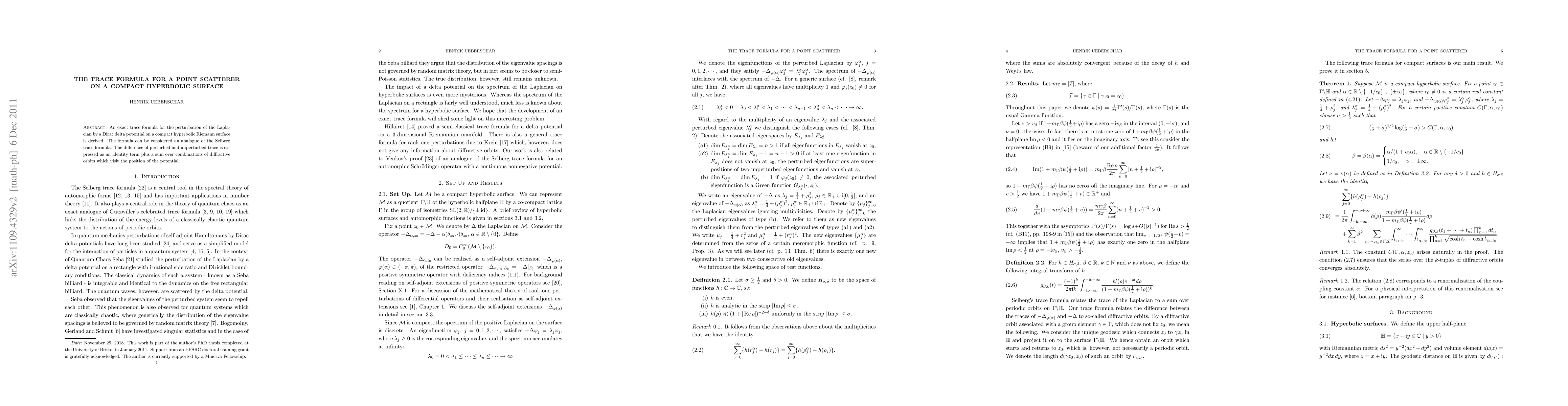 The paper derives an exact trace formula for the Laplacian perturbed by a Dirac delta potential on a compact hyperbolic Riemann surface, analogous to the Selberg trace formula, and expresses the difference between perturbed and unperturbed traces as an identity term plus a sum over diffractive orbits.