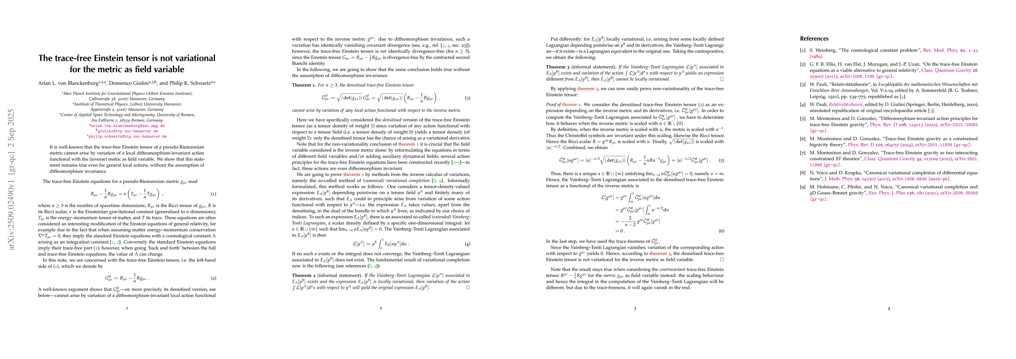 It is well-known that the trace-free Einstein tensor of a pseudo-Riemannian metric cannot arise by variation of a local diffeomorphism-invariant action functional with the (inverse) metric as field variable. We show that this statement remains true even for general local actions, without the assumption of diffeomorphism invariance.