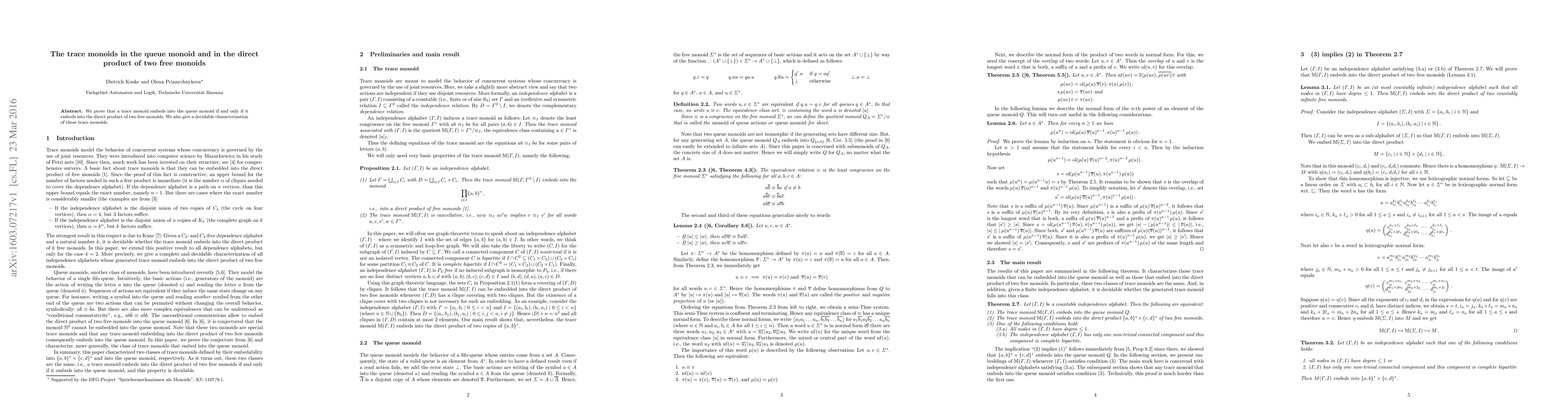 A study shows that a trace monoid can embed into either the queue monoid or the direct product of two free monoids, with a decidable characterization available for these cases.