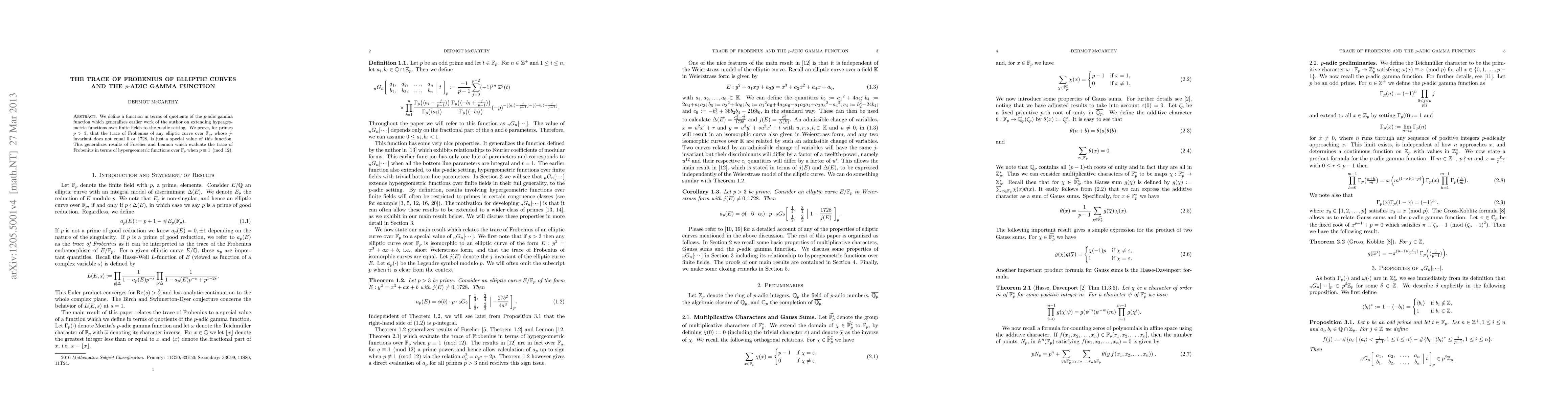 This paper defines a function based on quotients of the $p$-adic gamma function to generalize hypergeometric functions over finite fields. It proves that for primes $p > 3$, the trace of Frobenius of elliptic curves over $\mathbb{F}_p$ is a special value of this function, extending previous results for $p \equiv 1 \pmod {12}$.