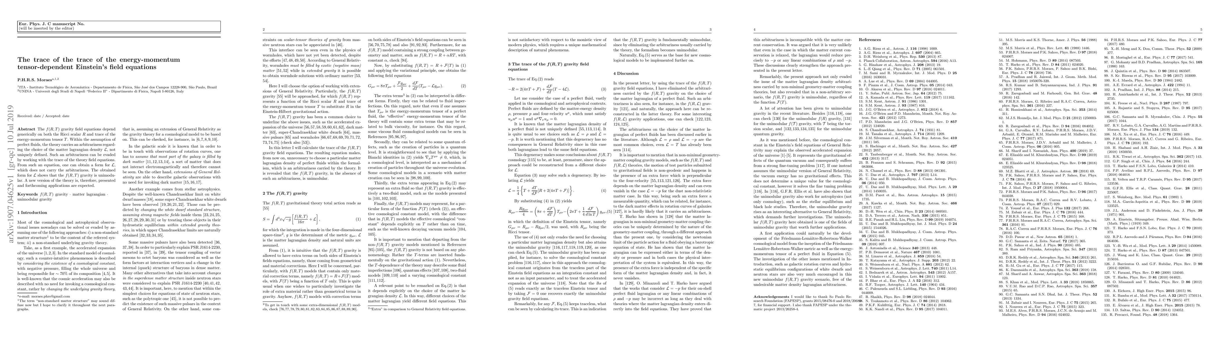 This paper explores the $f(R,T)$ gravity theory, which depends on both the Ricci scalar $R$ and the trace of the energy-momentum tensor $T$. It proposes a method to eliminate arbitrariness in the matter Lagrangian density $\mathcal{L}$ by analyzing the trace of the field equations, revealing that $f(R,T)$ gravity is unimodular.