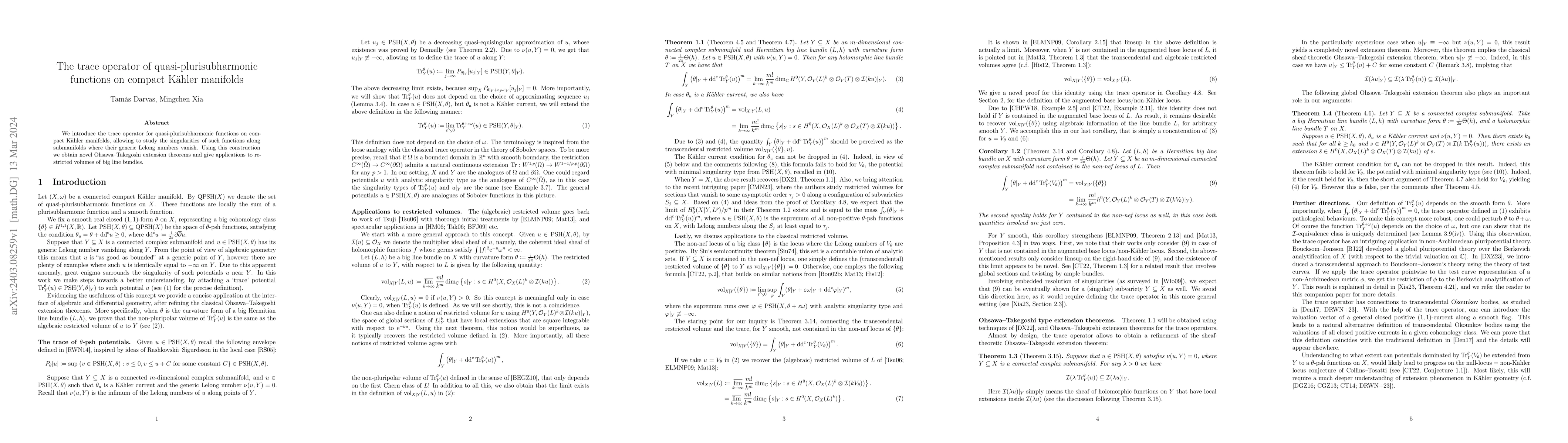 Summary: The paper introduces a trace operator for quasi-plurisubharmonic functions on compact Kähler manifolds, facilitating the study of singularities along submanifolds and yielding new extension theorems and applications to the restricted volumes of big line bundles.